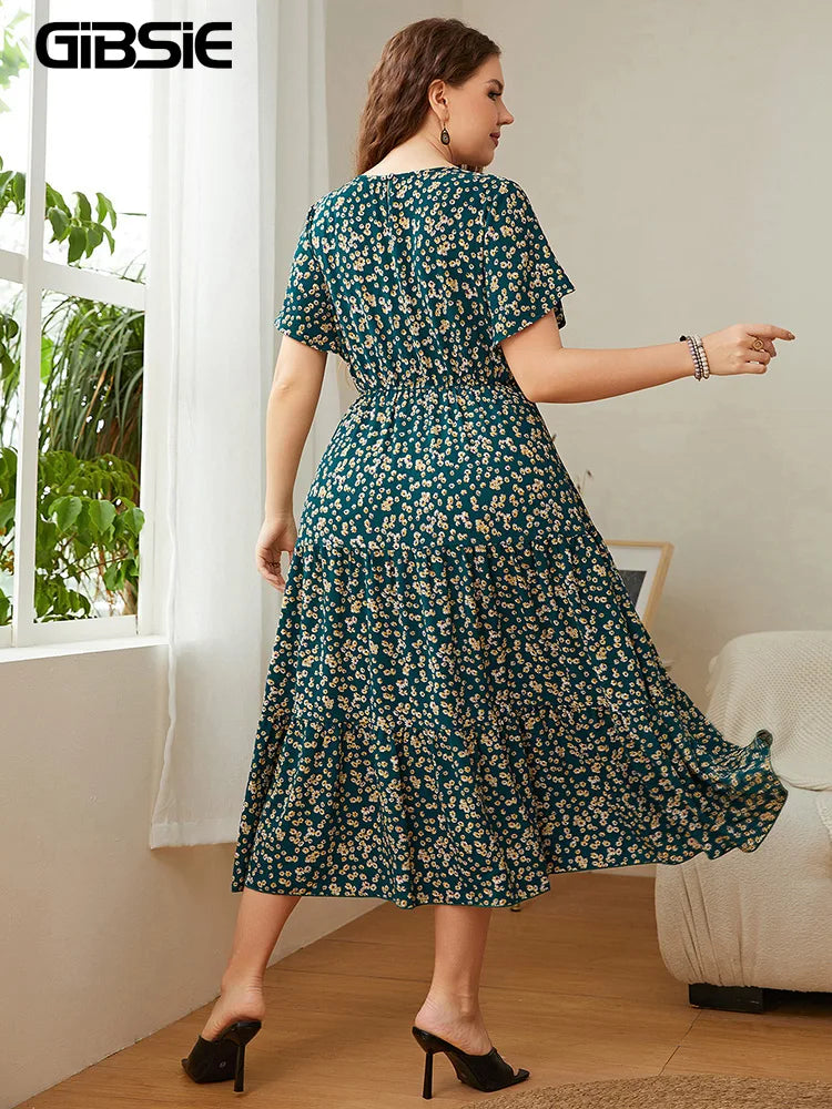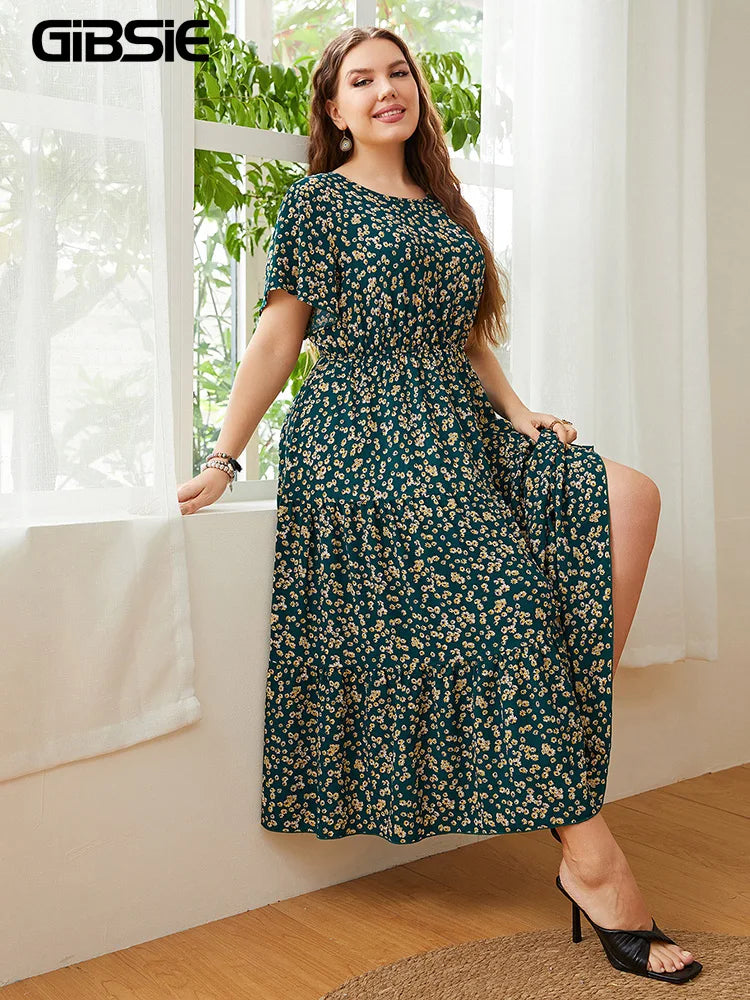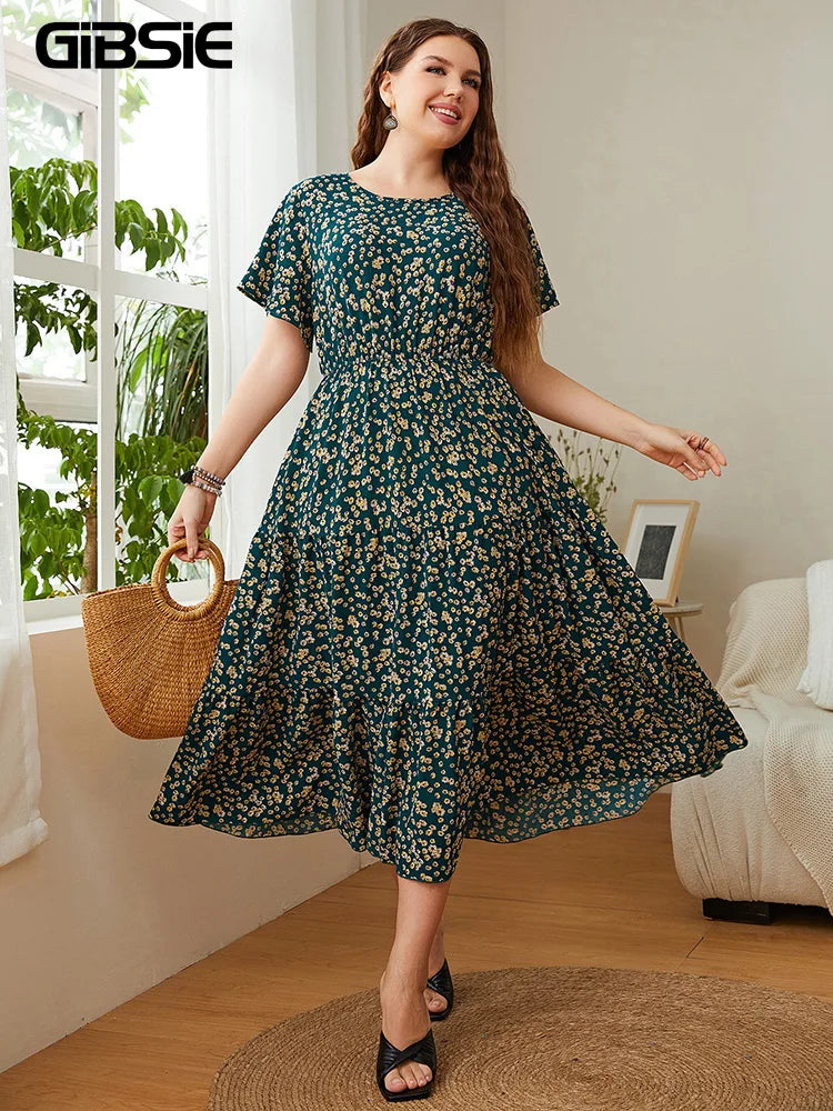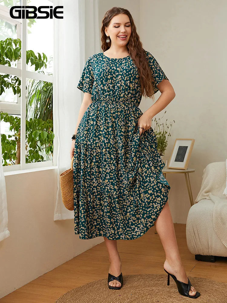 Elevate your wardrobe with the GIBSIE Plus Size Ditsy Floral O-Neck Ruffle Hem Dress, a stunning blend of comfort and style perfect for any occasion. This women's dress features a charming ditsy floral pattern, capturing the essence of summer with its vibrant, eye-catching colors. The O-neck design and ruffle hem add a touch of elegance, making it ideal for both casual outings and special events.