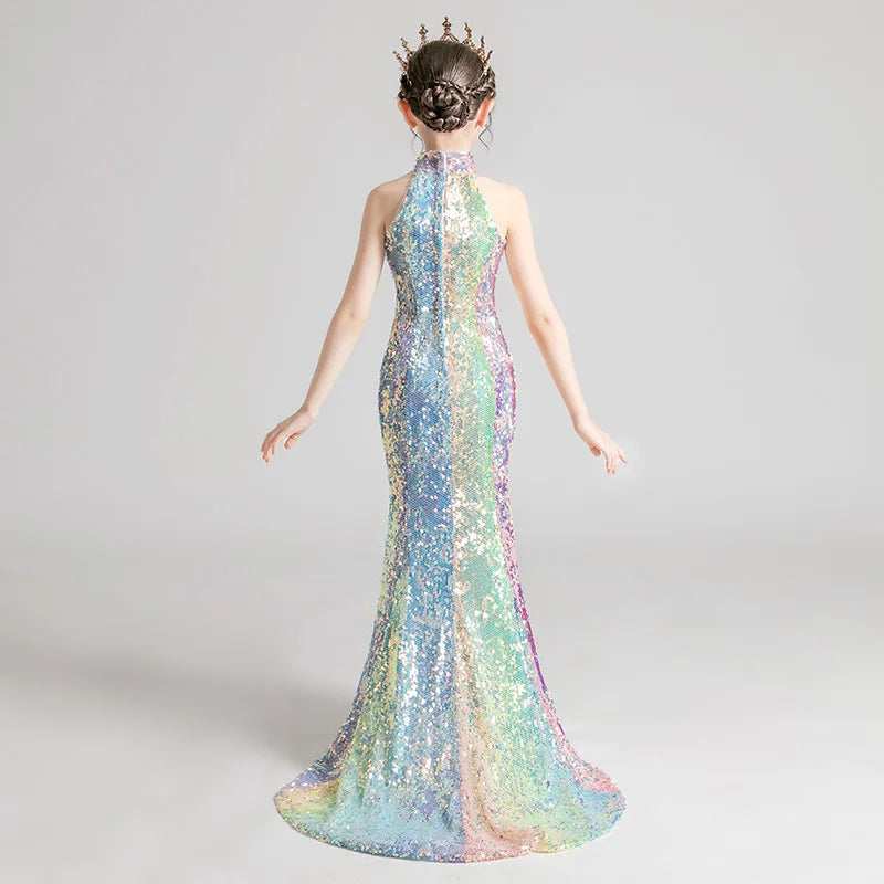 Featuring a graceful mermaid silhouette, this dress flows beautifully, creating a stunning effect at any evening event. The intricate design and high-quality materials ensure your little one looks and feels like a princess, whether she's attending a birthday party, a formal gathering, or any special celebration.