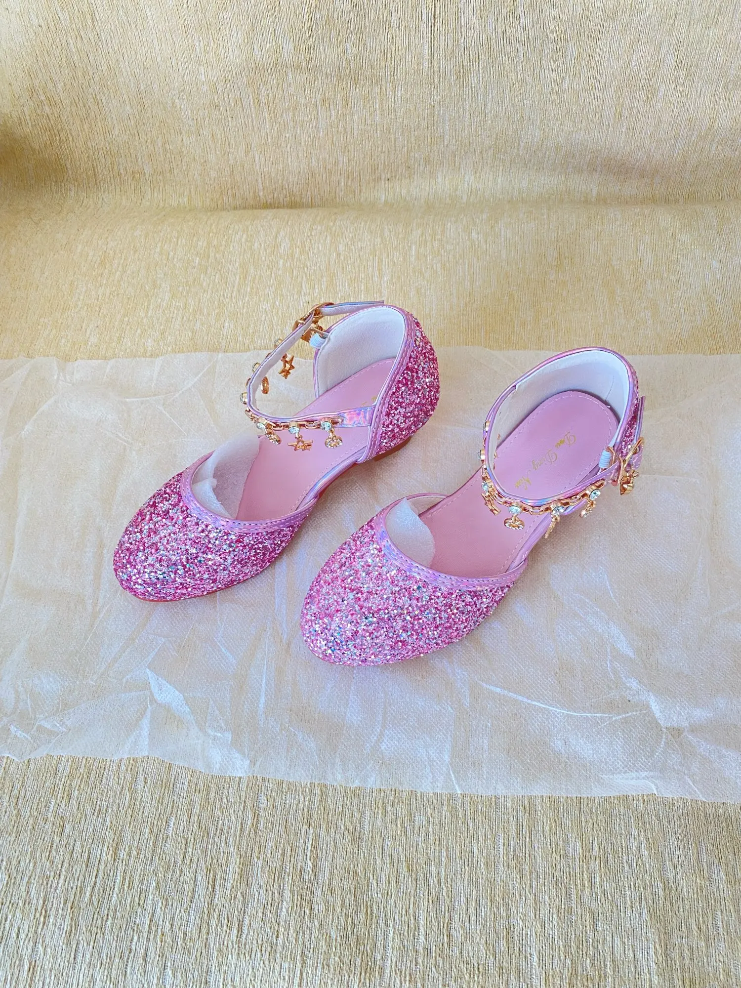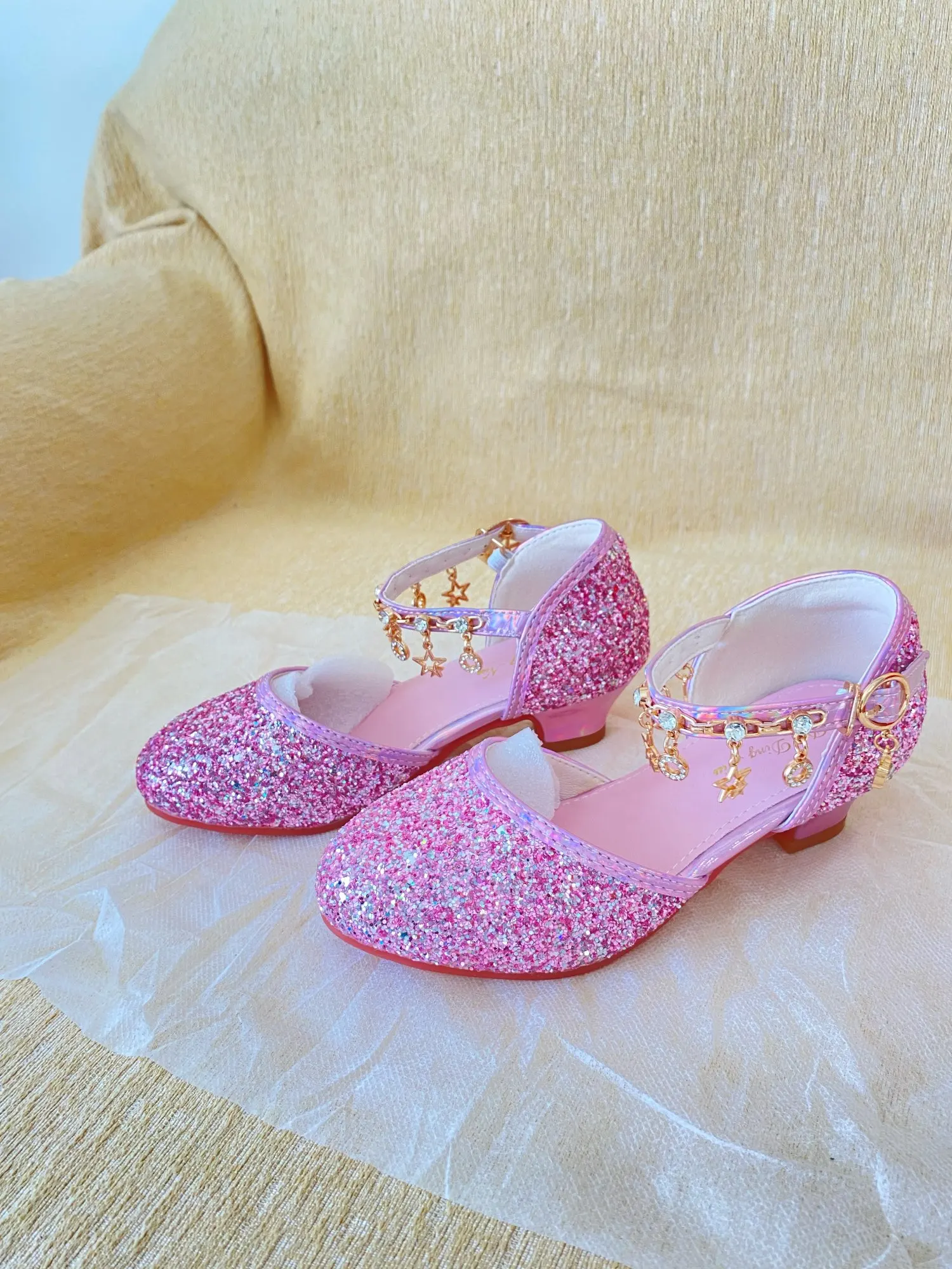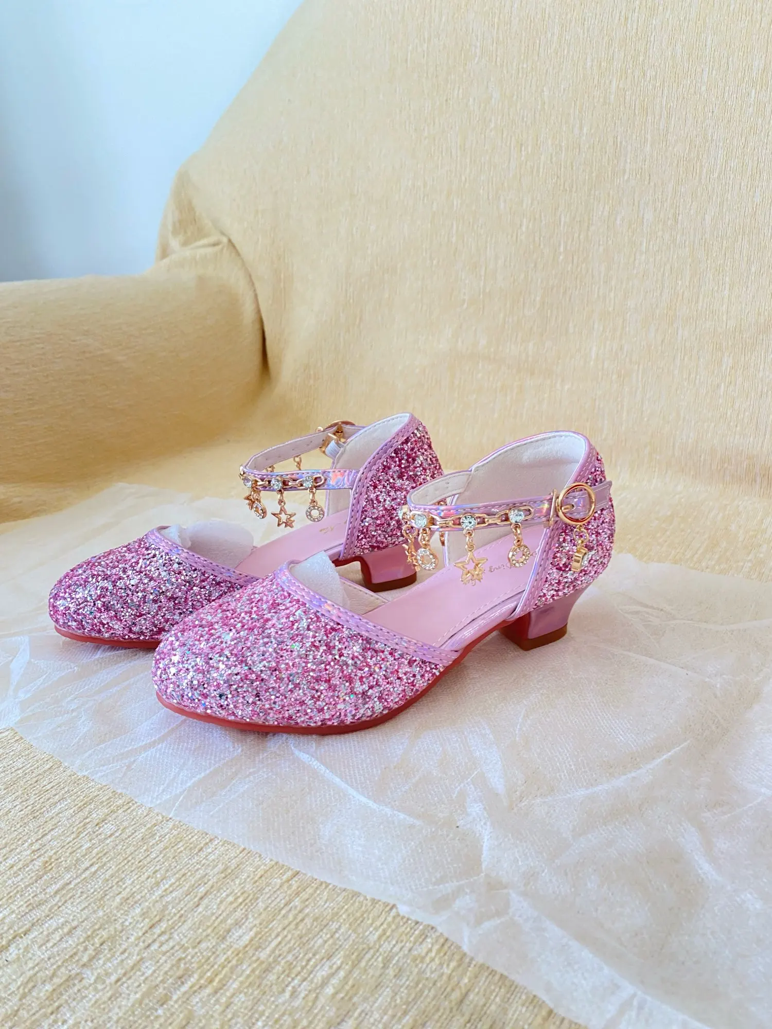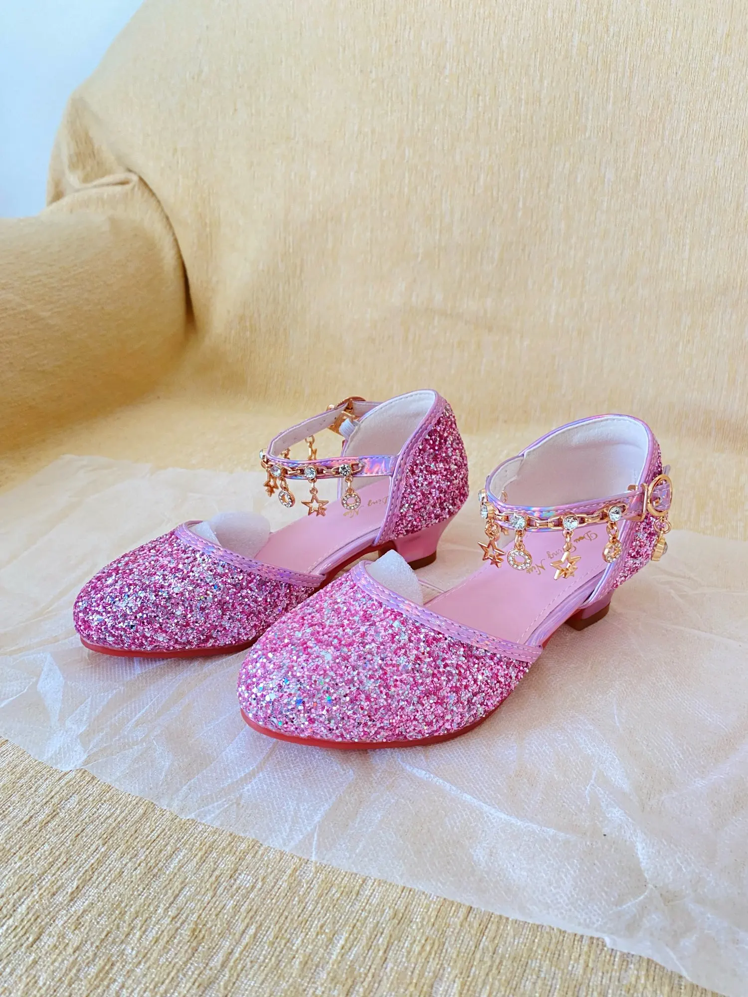 - Stunning Design: These sandals feature a glittery finish and crystal accents, making them ideal for girls’ high heels and performance shoes.