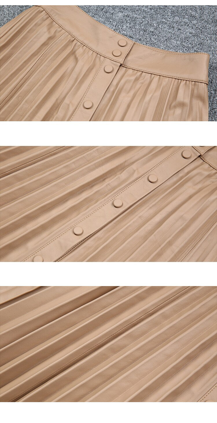 Pleated Long Skirt Women Natural Leather Pure Skin A-Line Buttons Maxi