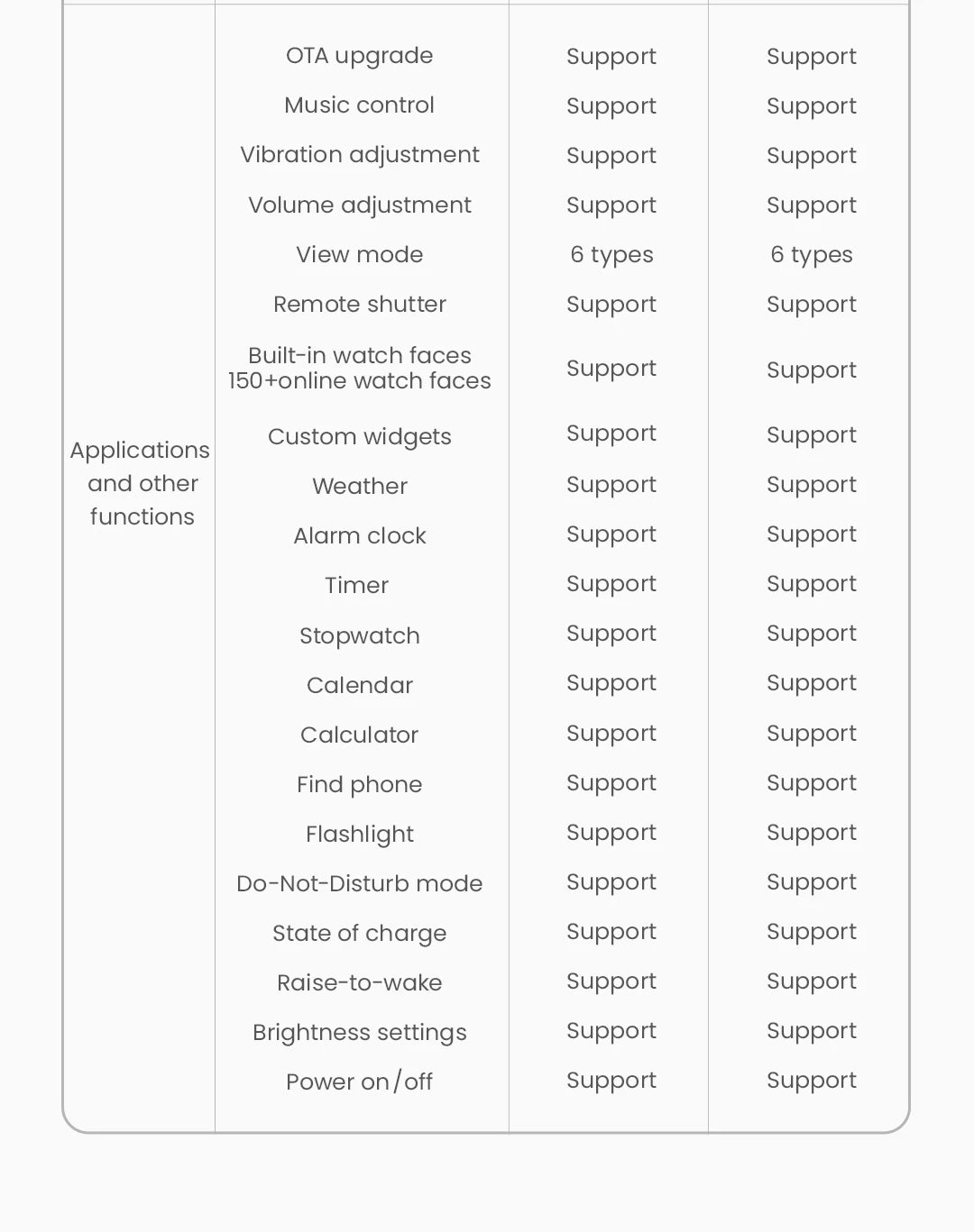 OTA upgrade / Music control / Vibration adjustment / Volume adjustment / View mode / Remote shutter / Built-in watch faces / 150+ online watch faces / Custom widgets / Weather / Alarm clock / Timer / Stopwatch / Calendar / Calculator / Find phone / Flashlight / Do-Not-Disturb mode / State of charge / Raise-to-wake / Brightness settings / Power on/off