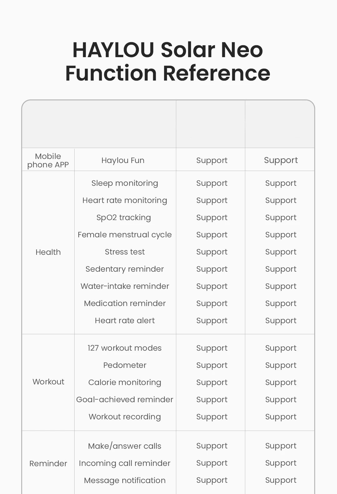 Sleep Monitoring / Heart Rate Monitoring / SpO2 Tracking / Female Menstrual Cycle / Stress Test / Sedentary Reminder / Water-intake Reminder / Medication Reminder / Hoart Rate Alort / Breathing Training