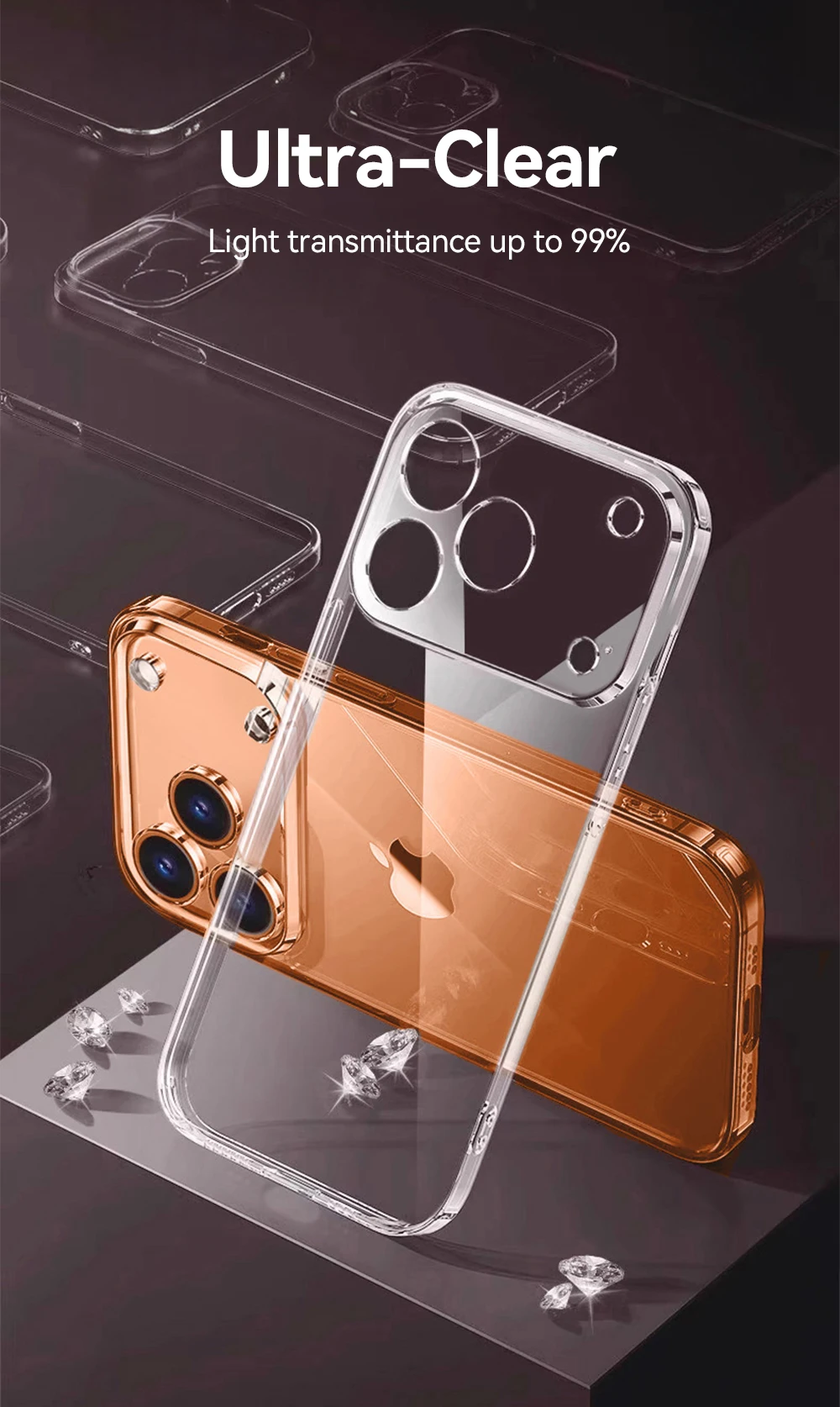1.Perfect Color Show & Never Yellow:aMade from high-quality Crystal PC and utilizing the latest AR technology, which increases light transmittance to up to 100%. That means showing off the true colors and details of your iPhone, making it stand out in any environment and look as good as new every day.