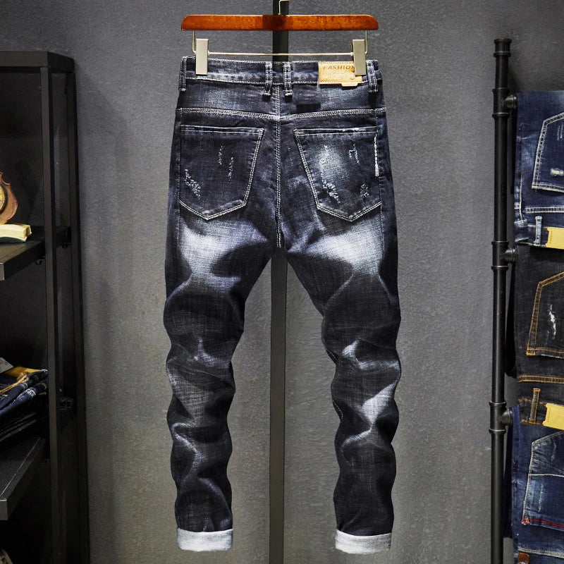 Upgrade your denim collection with the Ripped Jeans Men Dark Blue Stretch Slim Fit Distressed Denim Pants from our store. Experience the perfect blend of style, comfort, and durability in one versatile pair of jeans. Shop now and redefine your streetwear wardrobe!