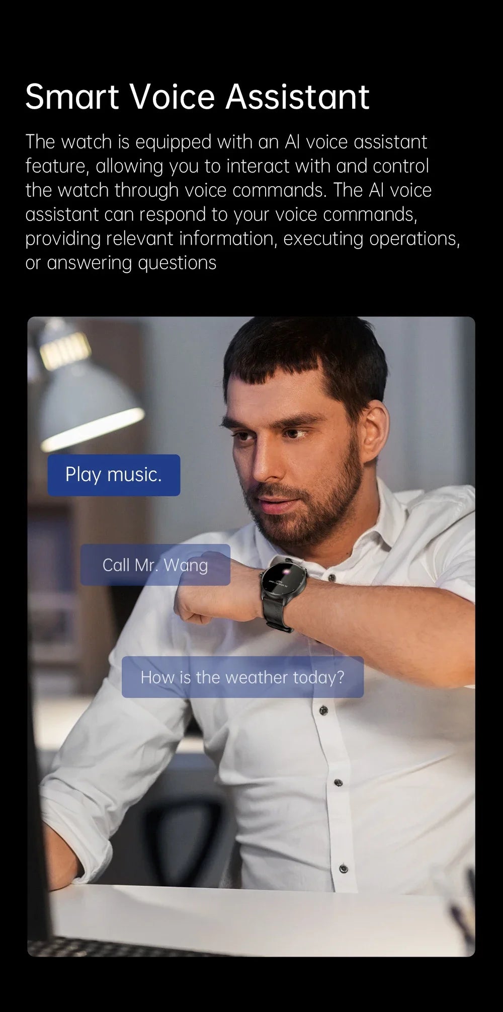 Everyday smart features: smart notifications (incoming calls, text messages, Gmail and smartphone app notifications), weather, Bluetooth Call, control smartphone music and camera, find my watch, do not disturb Mode.