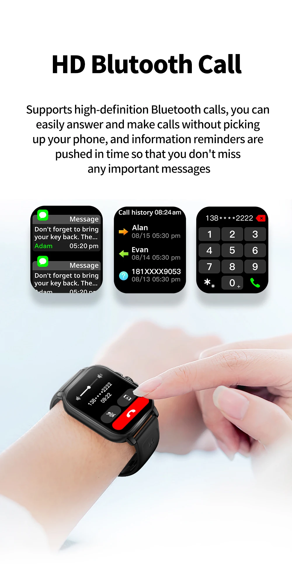 Function: Passometer,fitness tracker,sleep tracker,Message Reminder,Call Reminder,Answer Call,Dial Call,Push Message,Chronograph,Alarm Clock,World Time,Calorie Counter,week,Phase of the Moon,Speed Measurement,Month,Heart Rate Tracker,Calendar,Countdown,Calculators