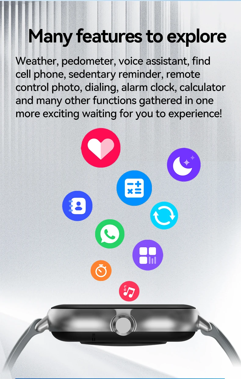 Function: Passometer,fitness tracker,sleep tracker,Message Reminder,Call Reminder,Answer Call,Dial Call,Push Message,24 hour instruction,Alarm Clock,World Time,Power Reserve,Perspective Window,week,Month,Heart Rate Tracker,Interactive Music,Noctilucent,Calendar,Lighting,Countdown,Calculators
