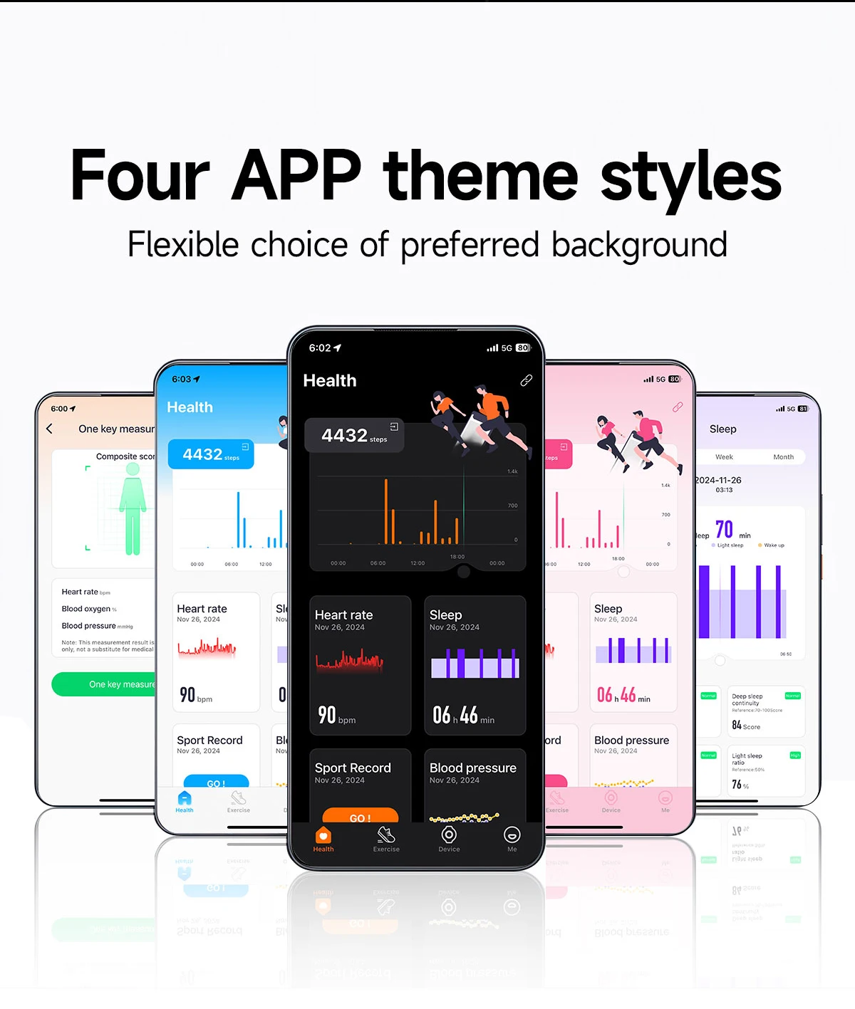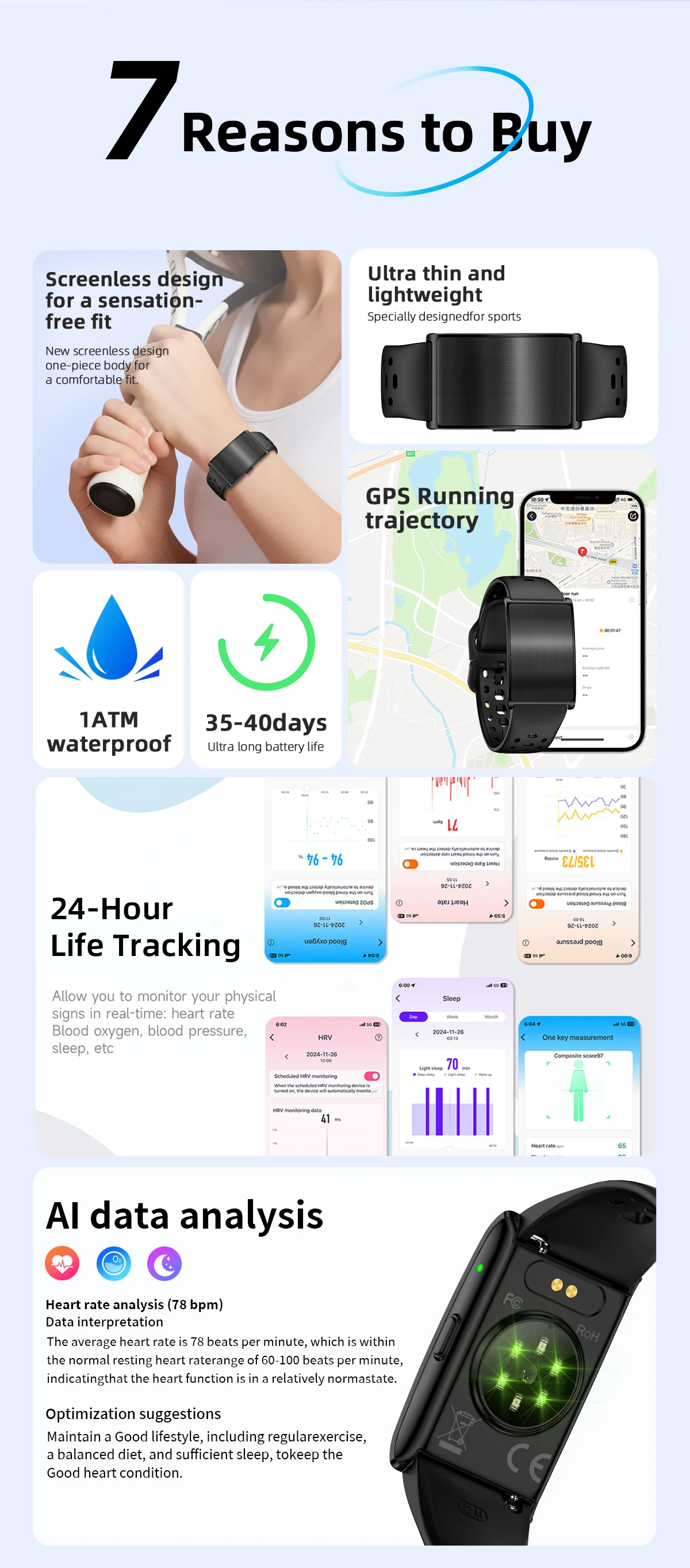 Incoming call reminder,Find the Bracele,Clock,Shutter,DND,OTA,24h Blood Oxygen,24h Blood Pressure,24h Heart Rate,Pressure testing,Menstrual cycle,GPS running under app connecting,HRV monitoring,Sleeping,Ai health report,3 color lights,Sedentary reminder,Code Scanning,Reset