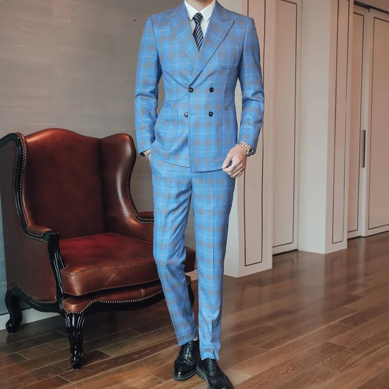 Our light blue plaid slim double-breasted suit is a testament to impeccable tailoring and distinctive design. The light blue plaid pattern adds a touch of modern sophistication, while the double-breasted jacket exudes timeless elegance. The premium fabrics and meticulous stitching ensure comfort and durability, making this suit a valuable addition to your formal wardrobe. This suit perfectly exhibits the charm of tailored suits.