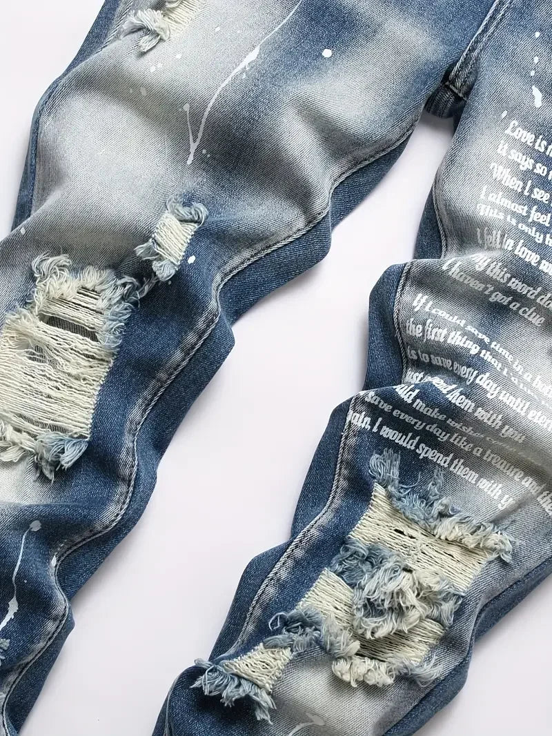 Men Y2k Stretchy Denim Jeans Ripped Skinny Letter Print Elastic Waist Casual Pants