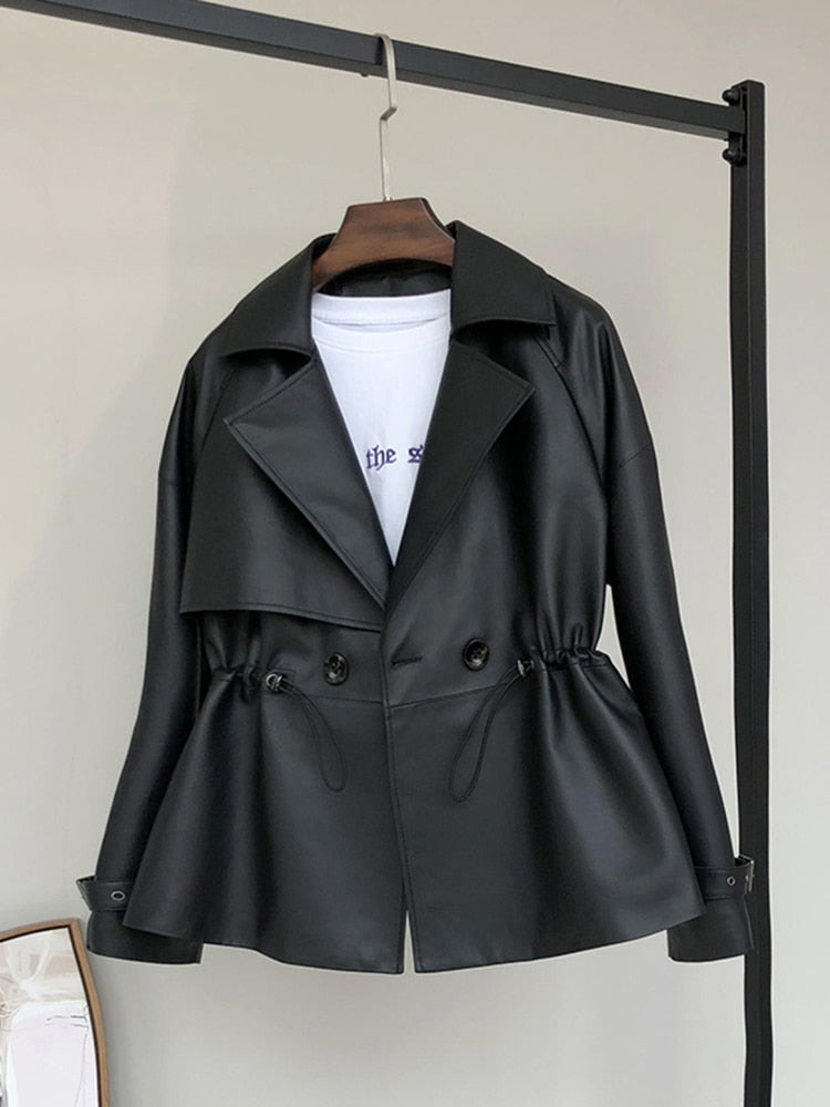 Spring Black Short Soft Faux Leather Trench Coat for Women Coats