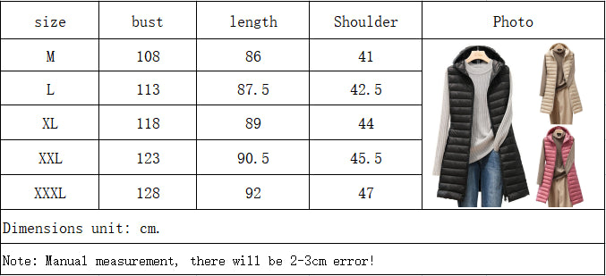 Introducing our Female Autumn and Winter Medium Long Hooded Light Down Padded Jacket Waistcoat, designed to provide the perfect blend of style and comfort during the chilly months. This versatile jacket women puffer is not only lightweight but also offers the warmth you need, making it a staple in your wardrobe for those crisp autumn days and cold winter nights.