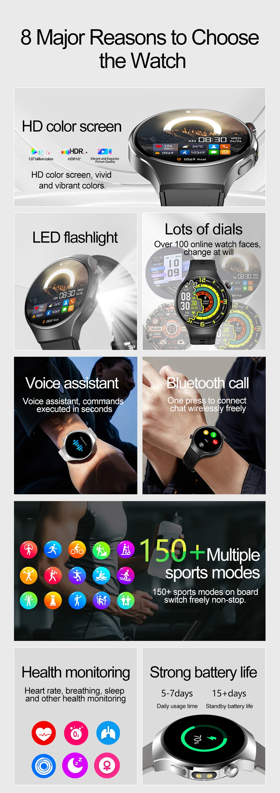 Basic Functions: Bluetooth calling, high-brightness flashlight, heart rate monitoring, breathing exercises, women's health (period tracking), sleep monitoring, sedentary reminders, call notifications, calendar, alarm clock, stopwatch, weather, music control, voice assistant, timer, calculator, games, etc.