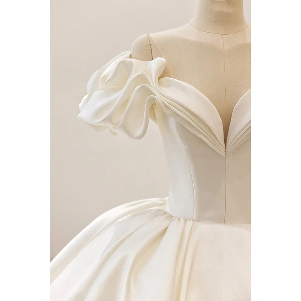 Our satin wedding dresses are renowned for their opulent sheen and smooth texture. The rich satin fabric of this ball gown drapes beautifully, creating a look that is both luxurious and sophisticated. The short sleeve neckline adds a touch of modesty, while the lace-up back detail provides a customizable fit and a visually stunning focal point.