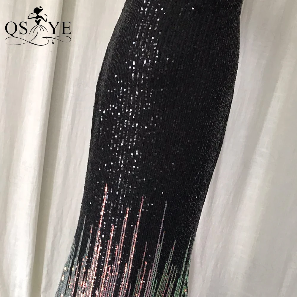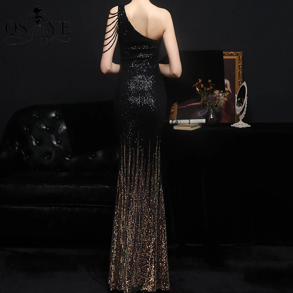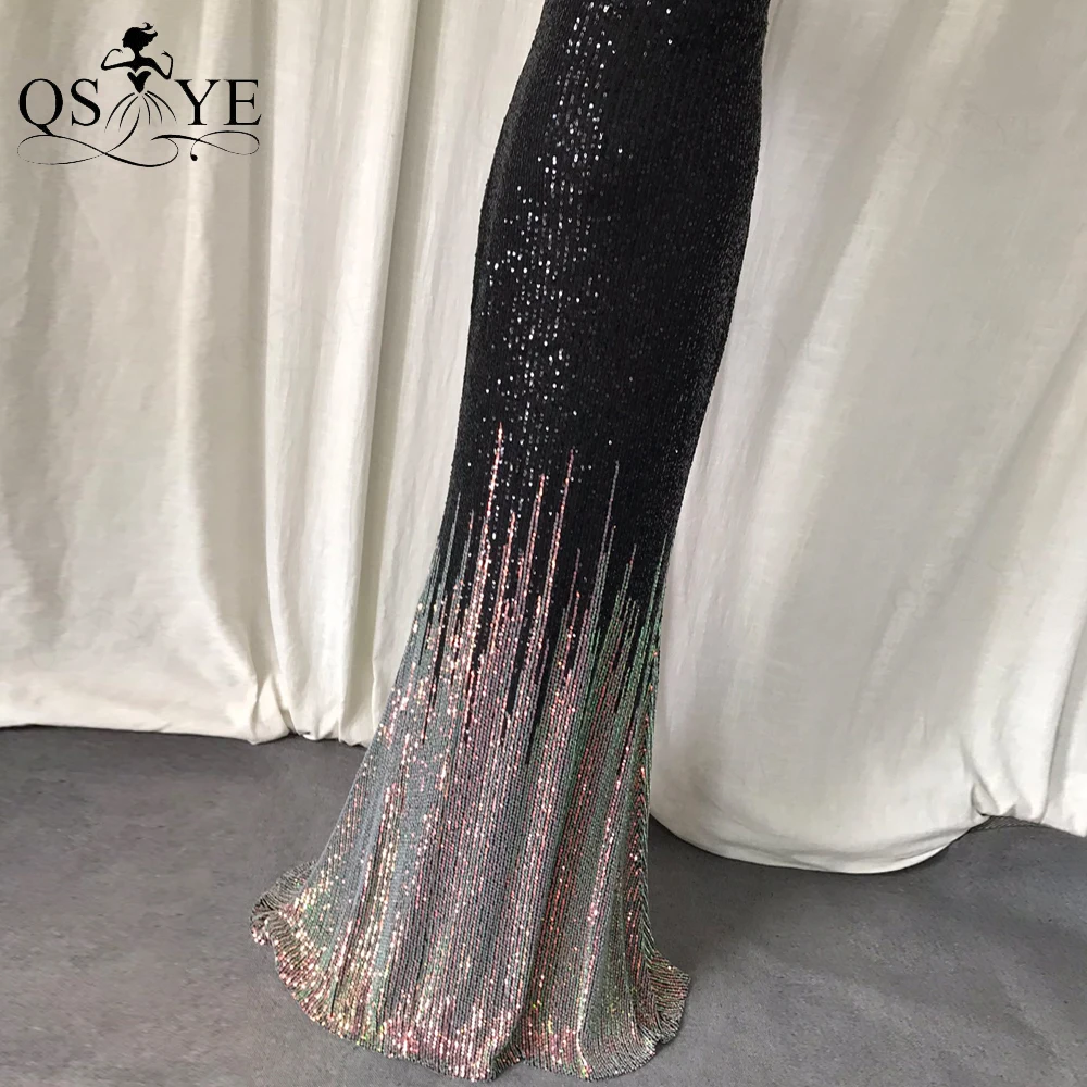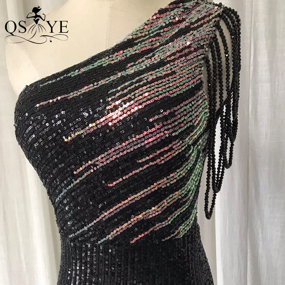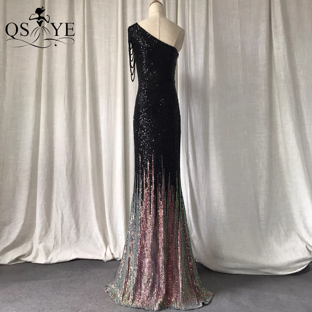 One Shoulder Black Prom Dresses Colorful Fade Beading Straps Evening Gown