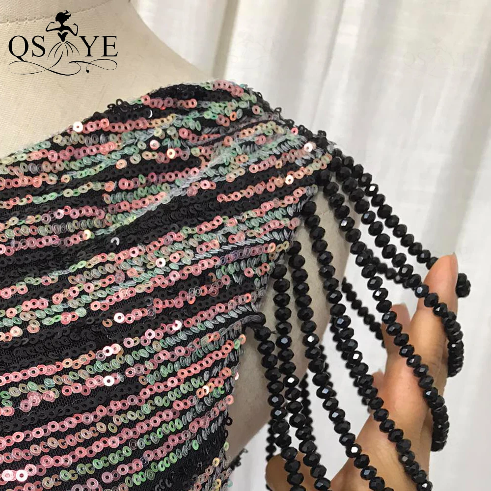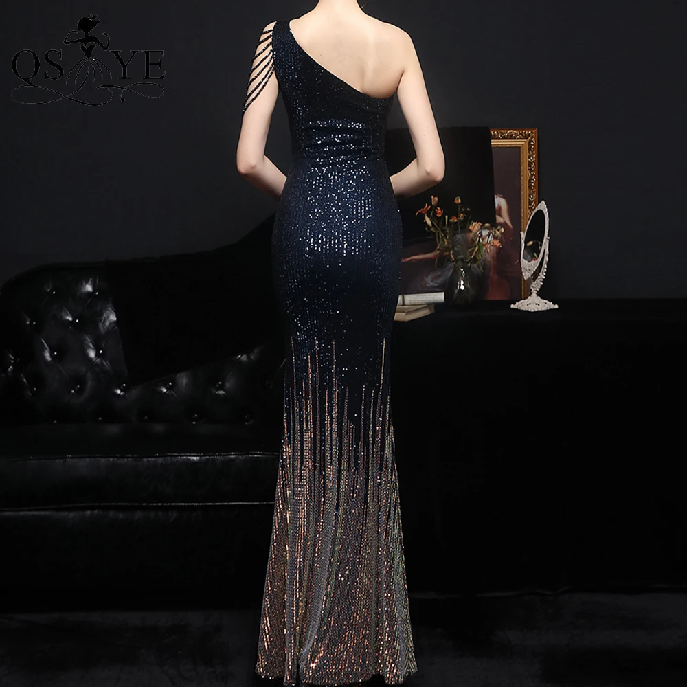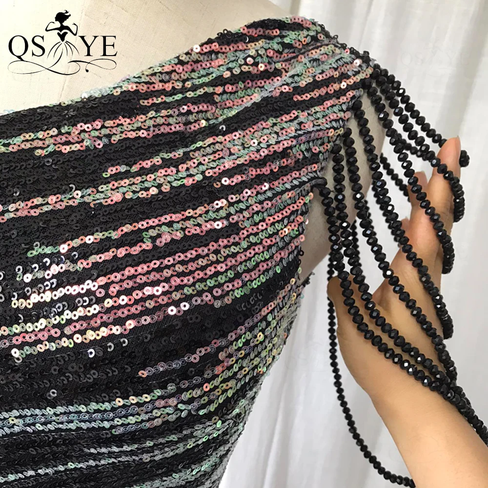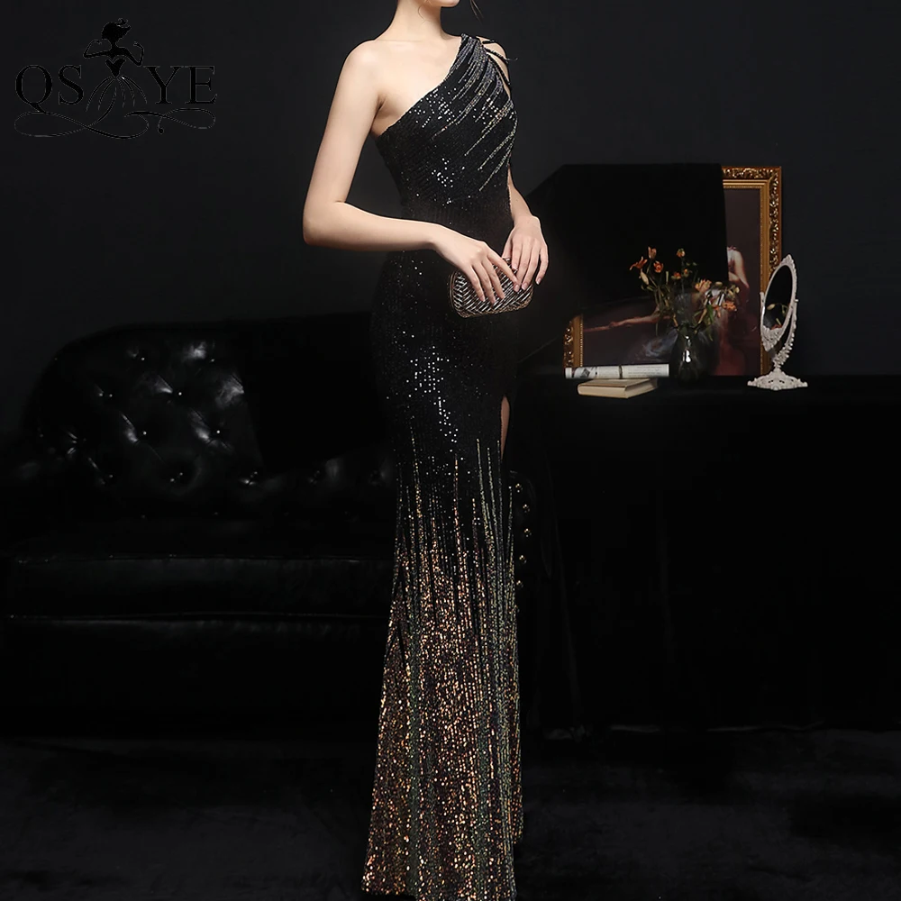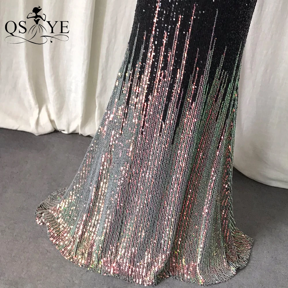 One Shoulder Black Prom Dresses Colorful Fade Beading Straps Evening Gown