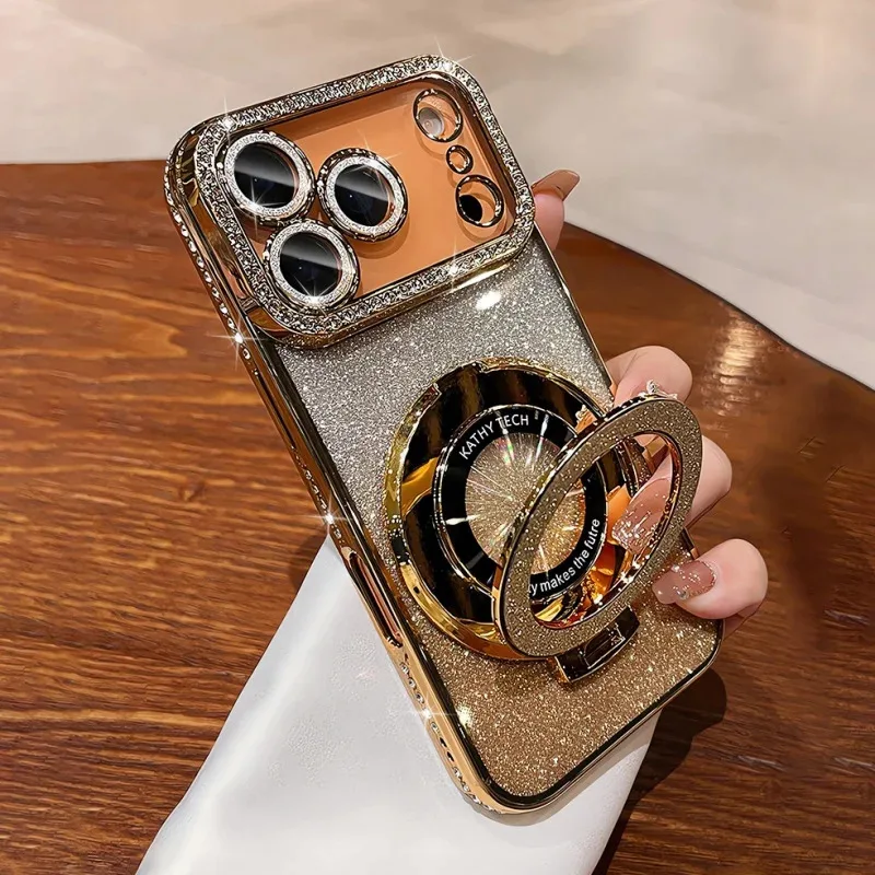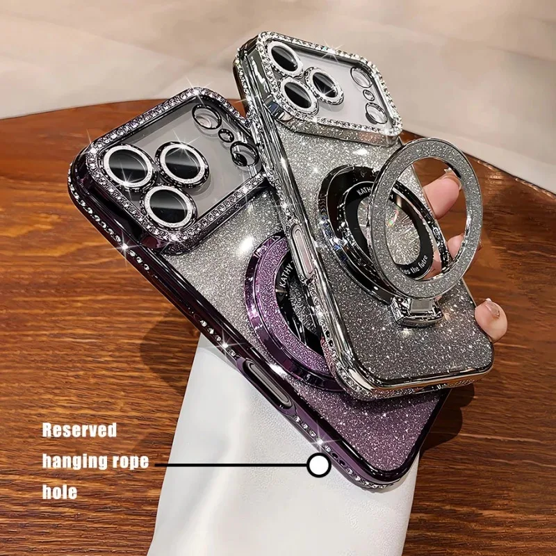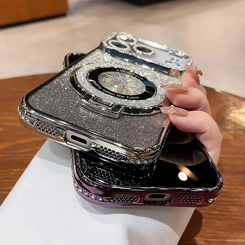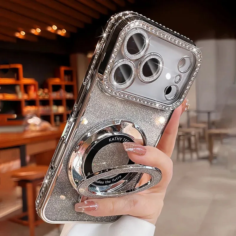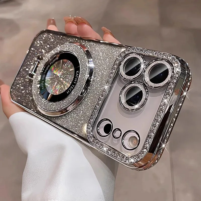 Plating transparent diamond glitter magnetic phone case for iPhone 17 16 13 14 15 Pro Max lens protection bracket back cover