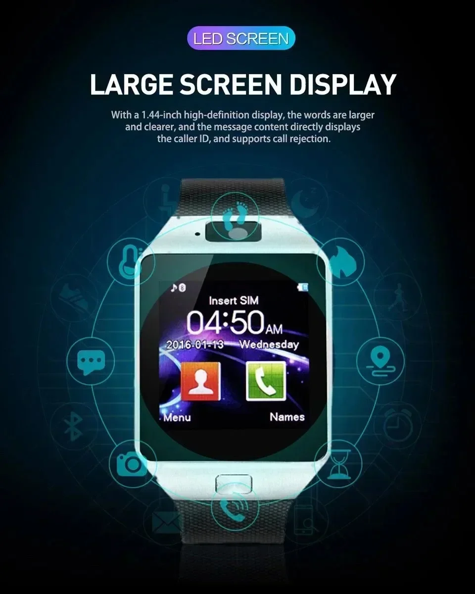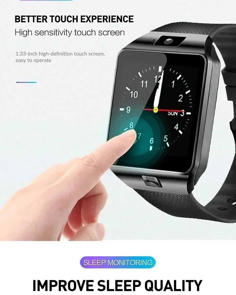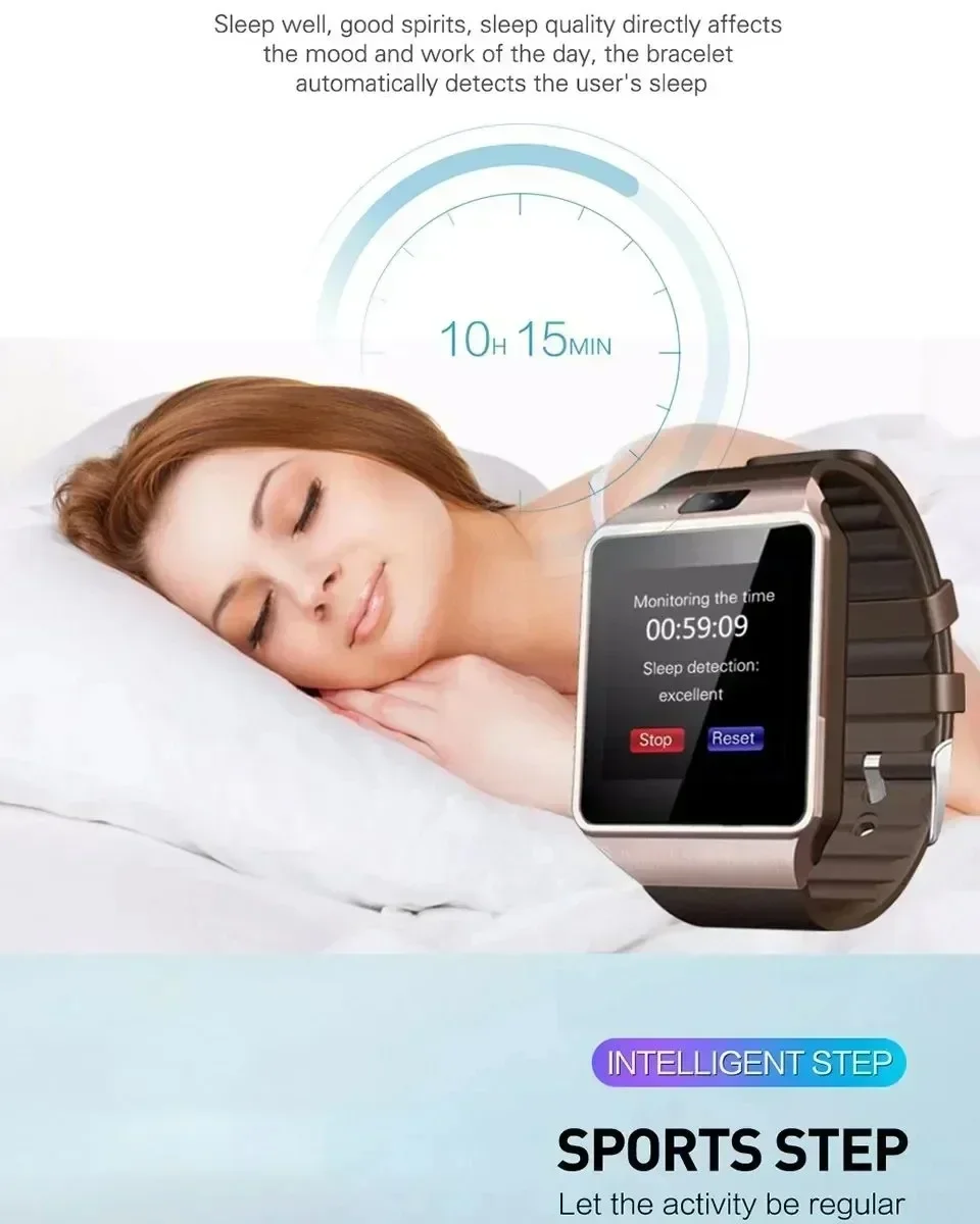 Stay connected on the go with Bluetooth calling, SIM card support, and real-time call and text notifications. Capture moments with the integrated camera, and switch between Android and iOS compatibility seamlessly. The DZ09 ensures you’re always reachable and fully equipped, whether at the gym, on a trail, or in the city.