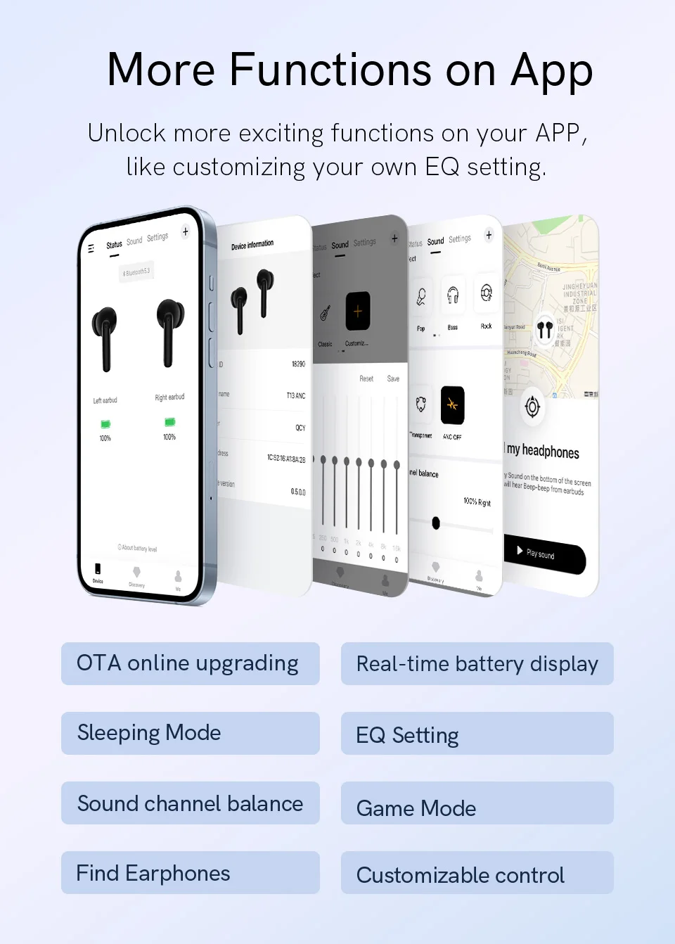 3. Adjustable Noise Canceling Levels.You can adjust both ANC noise canceling and transparency levels via QCY APP to fit yourself.