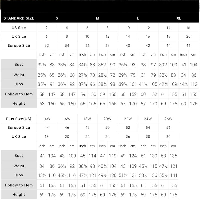 US16W size : Bust: 43 inches, Waist: 36.25 inches, Hips: 45.5 inches, Hollow to Floor: 61 inches.
