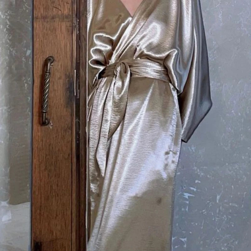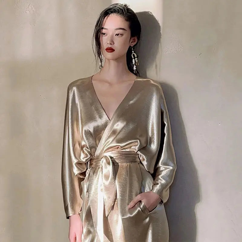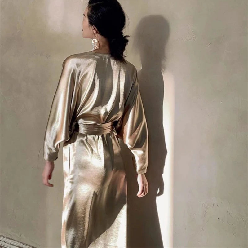 Elevate your evening look with our stunning Long Dress Women Glossy Long Sleeve V Neck Evening Wrap. This dress is designed for women who love to make a statement. Whether you're attending a gala, a wedding, or a night out on the town, this dress is your go-to choice for turning heads. Its glossy fabric and long sleeve design ensure you will be the center of attention at any event.