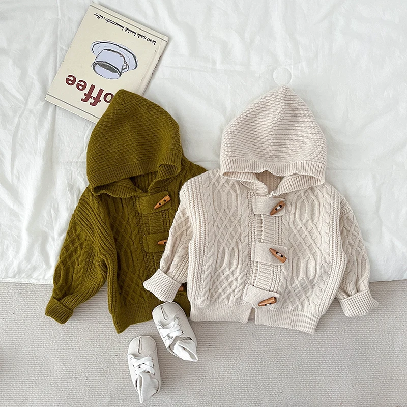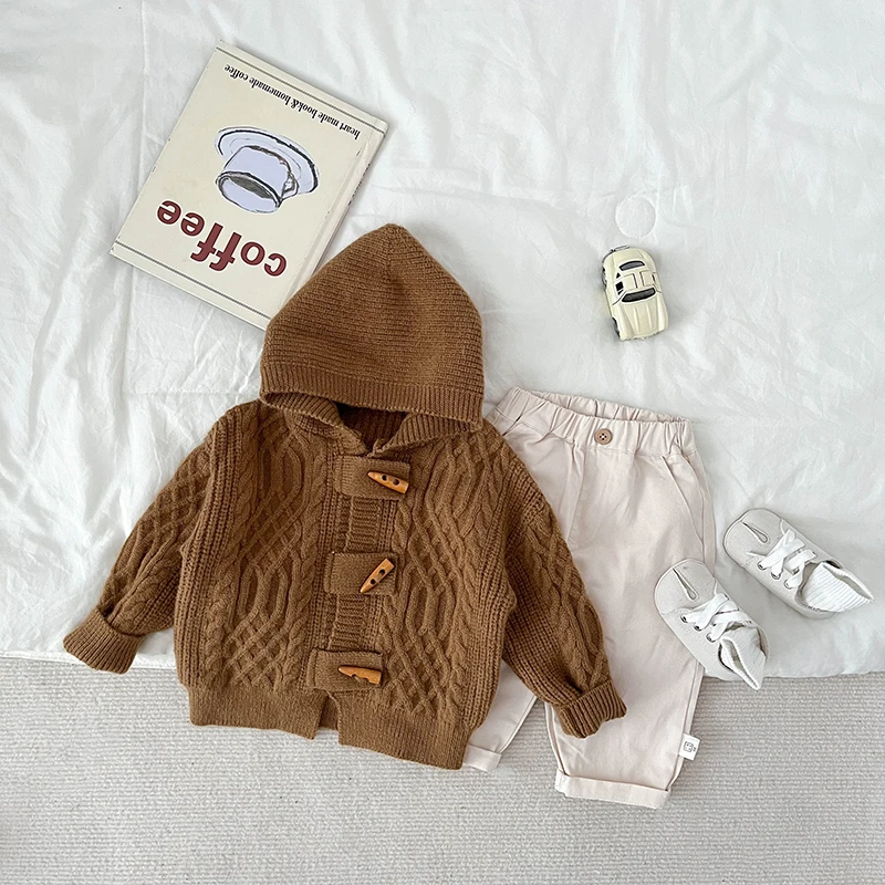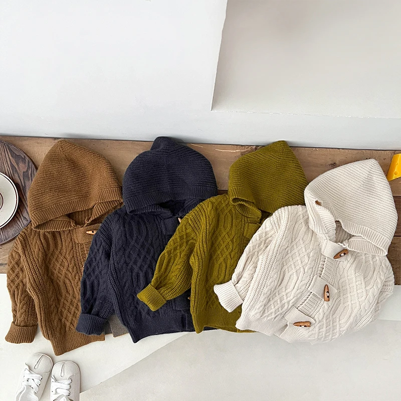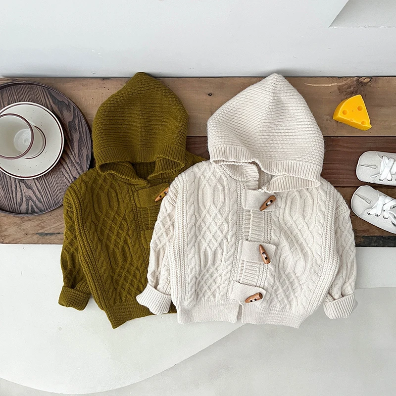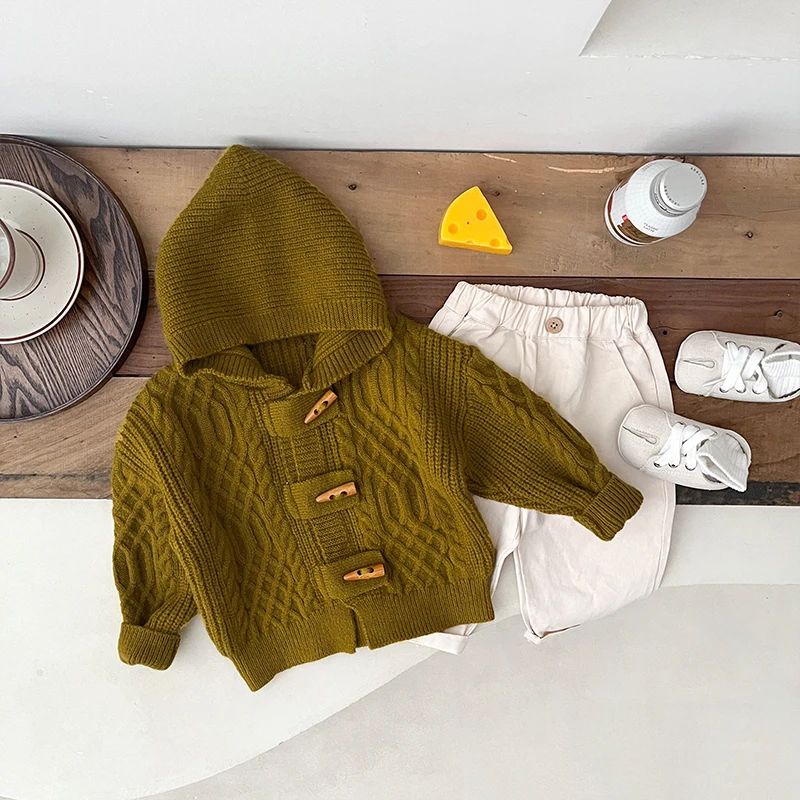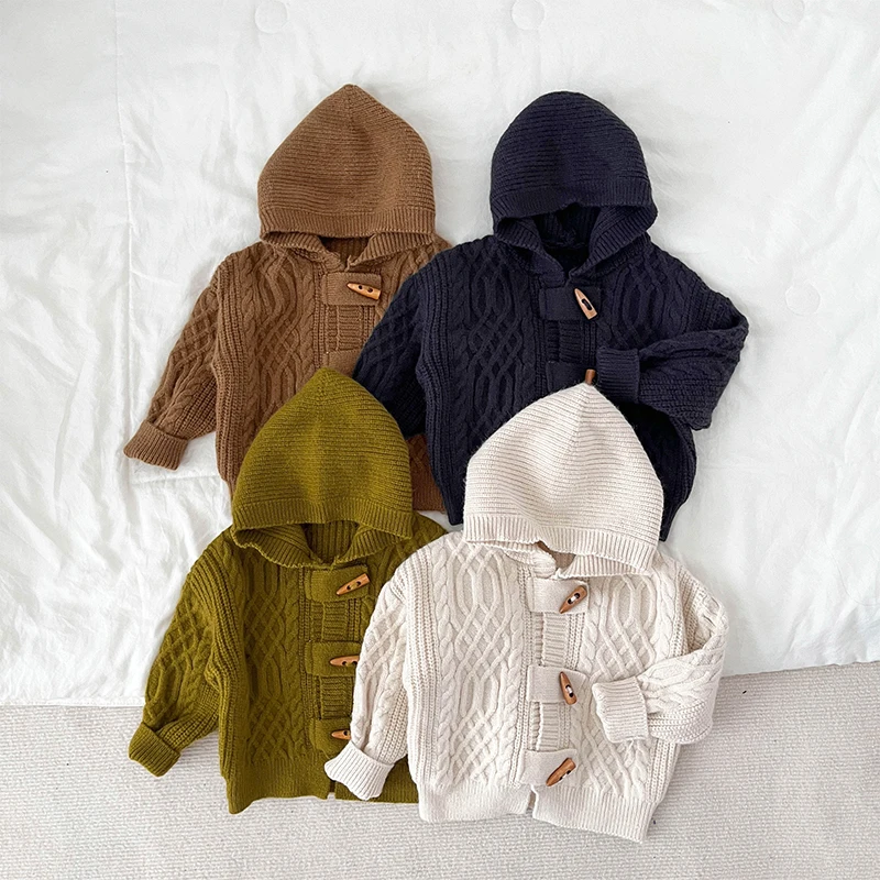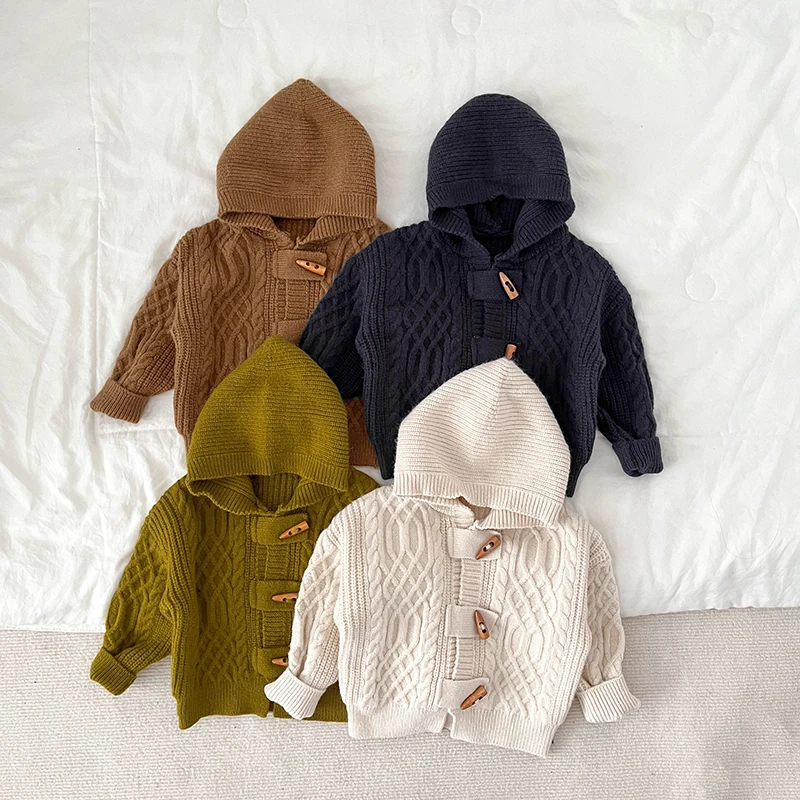 Baby Girls And Boys Solid Hooded Knitted Travel Coat Cotton Long Sleeved Korean Fashion Soft Casual