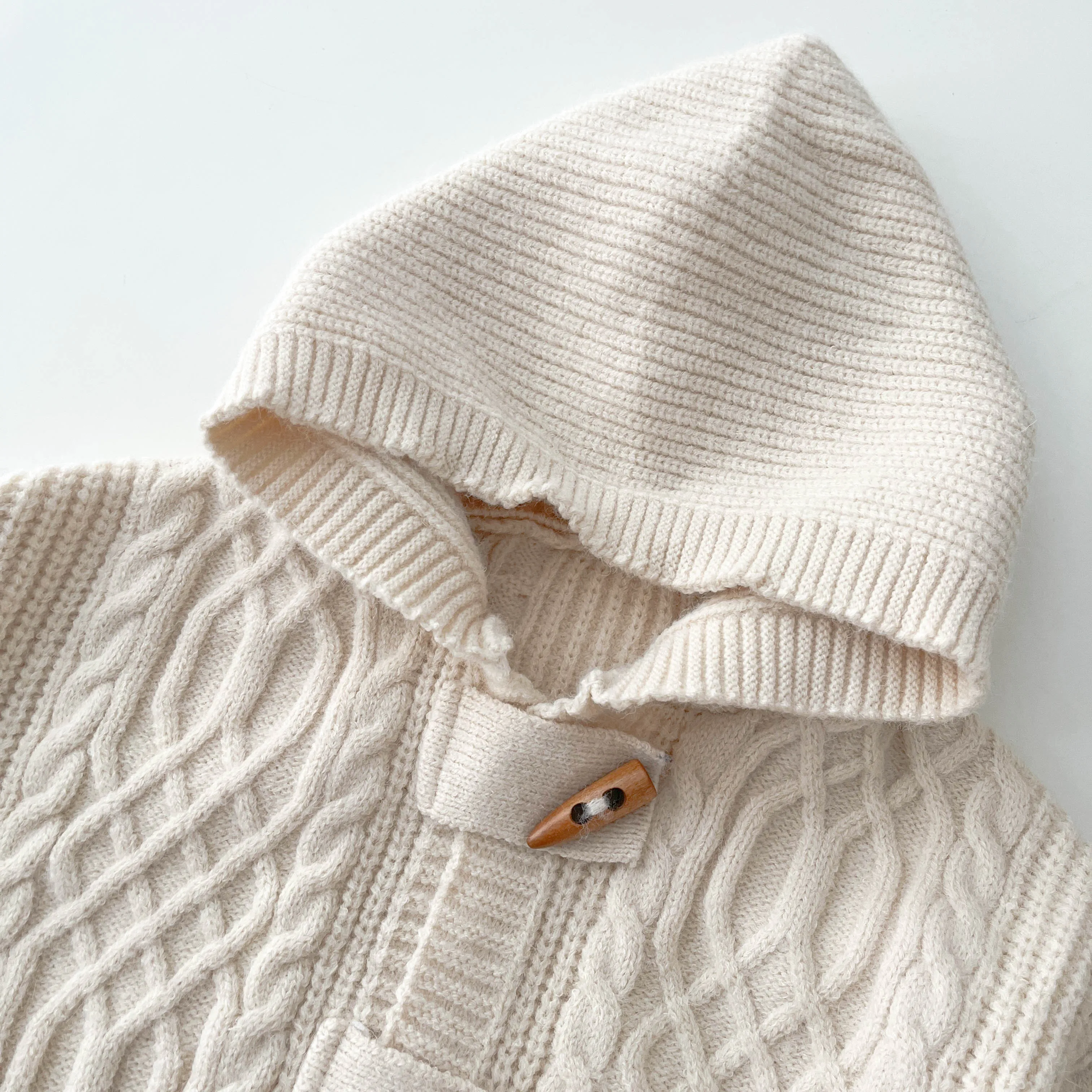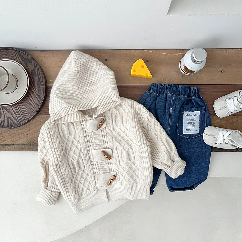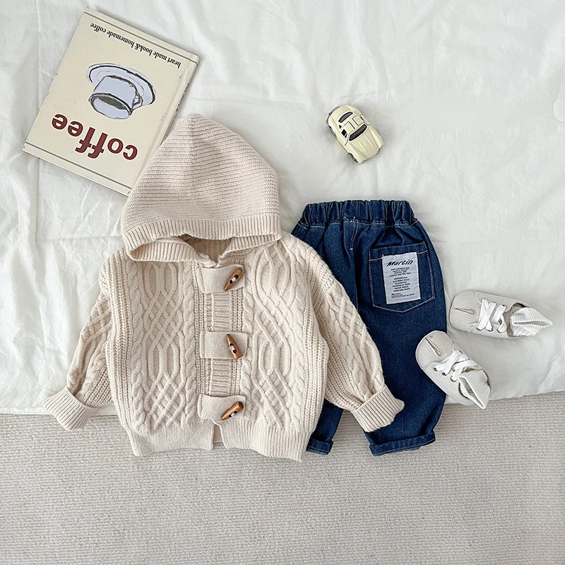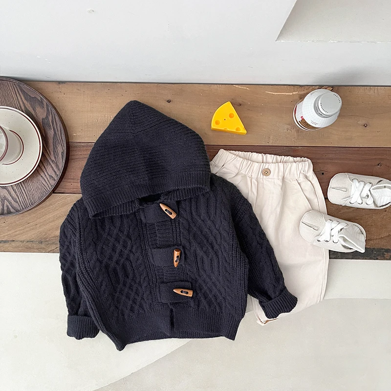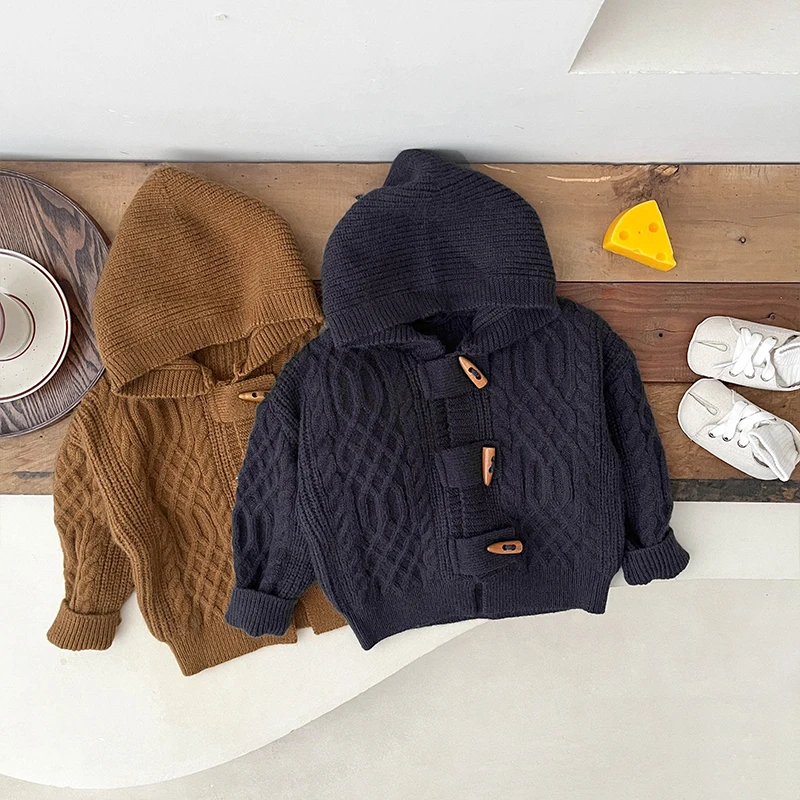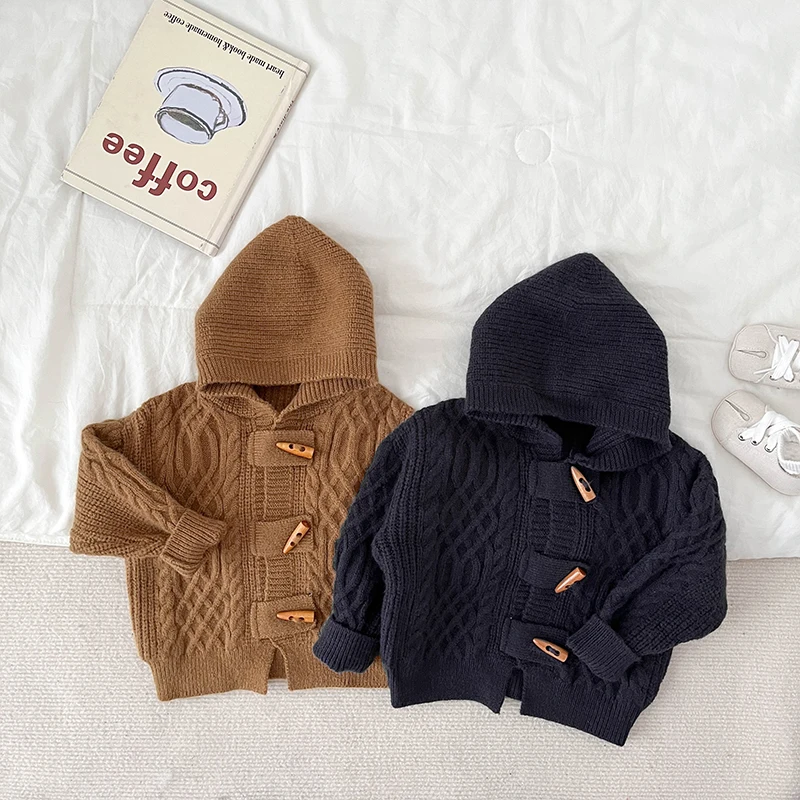 Baby Girls And Boys Solid Hooded Knitted Travel Coat Cotton Long Sleeved Korean Fashion Soft Casual