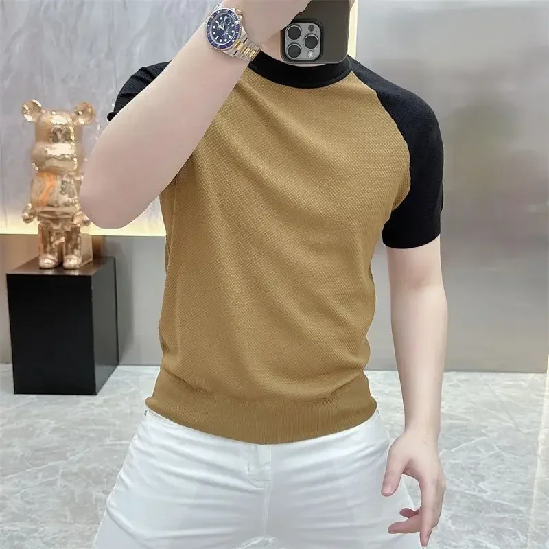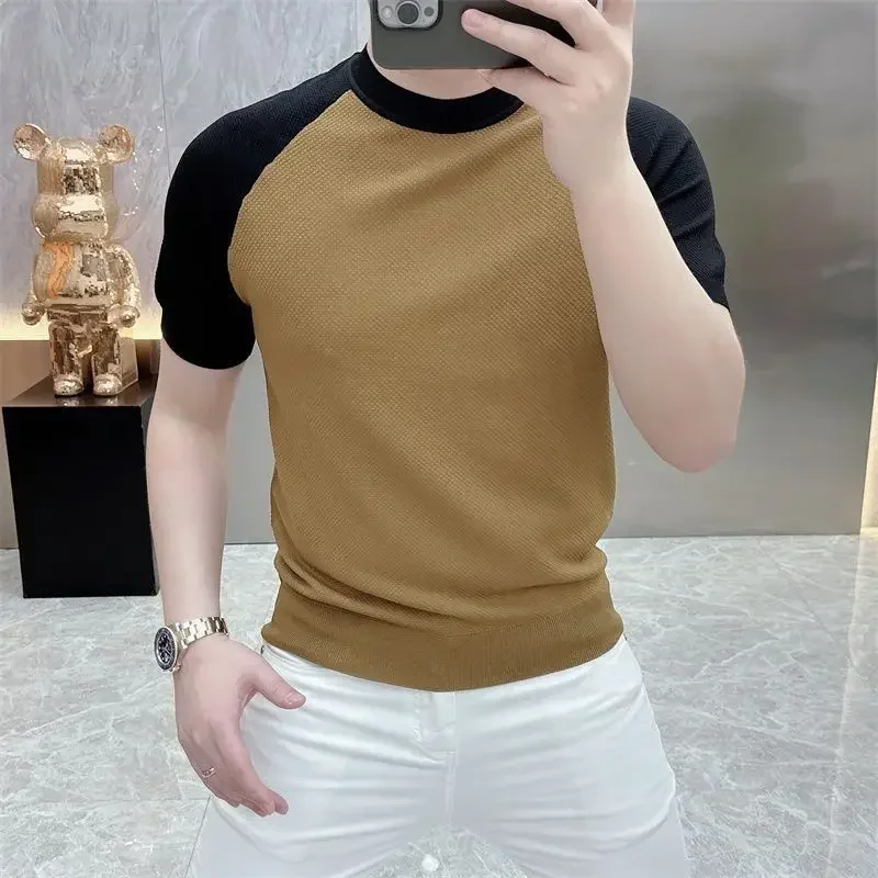Summer Korean Short-sleeved Casual T-shirt Men New Fashion Contrasting Color Slim Rotator Sleeves Breathable Round Neck Knitted