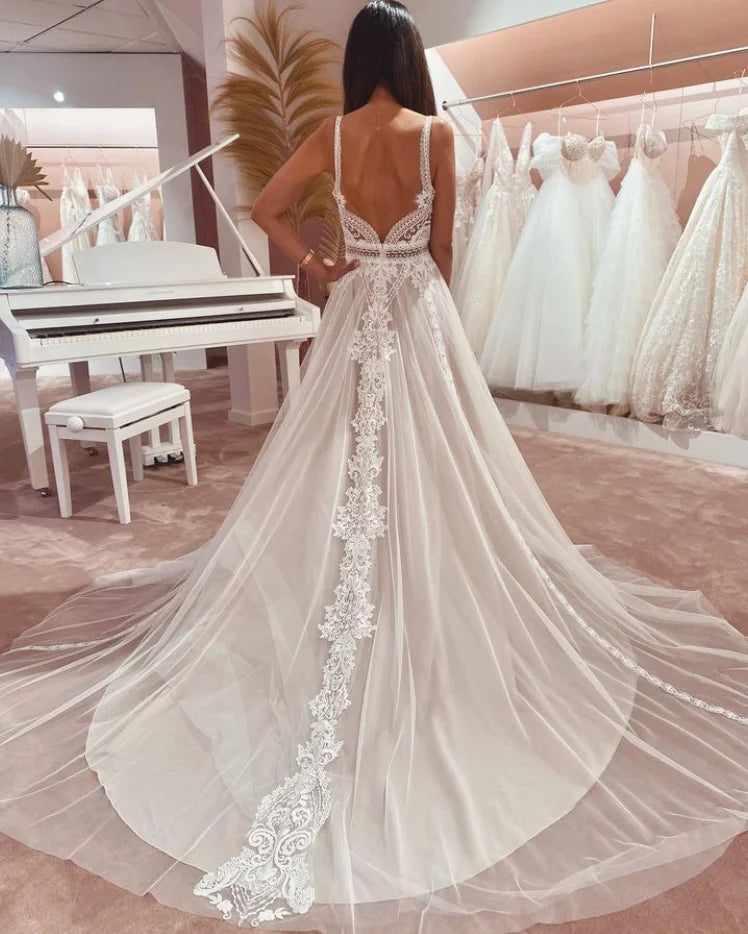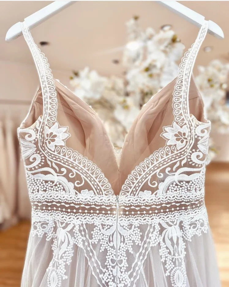 When selecting the ideal wedding dresses for your bridal party, you want something that balances modern trends with timeless grace. The V-neck and open-back design of this dress is an aesthetic masterpiece, ideal for themed weddings ranging from beach wedding dresses to vintage-inspired ceremonies. The intricate lace adds a sophisticated edge, aligning perfectly with today’s demand for bohemian wedding dresses.