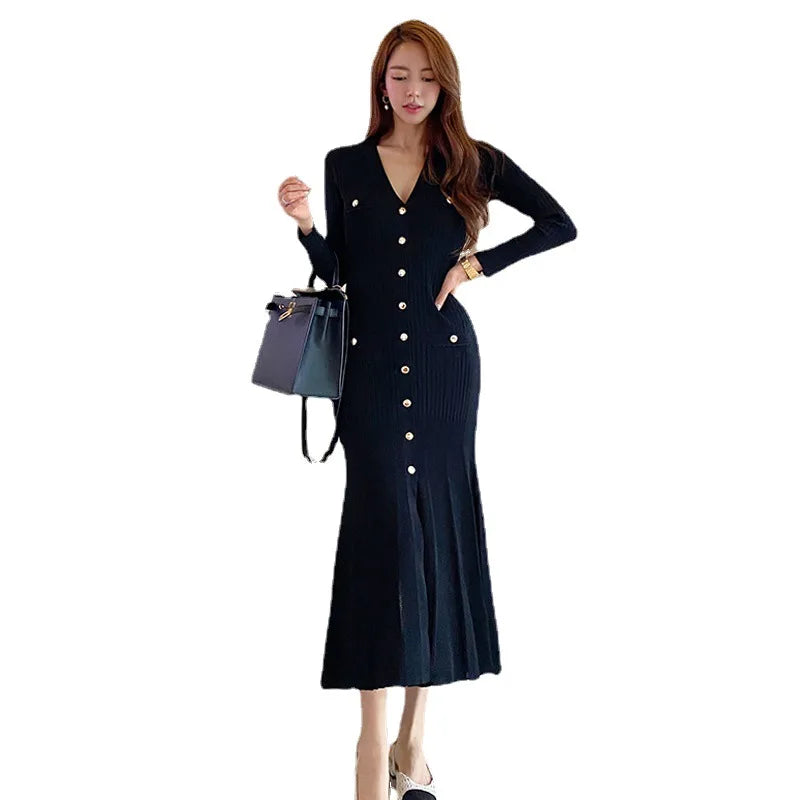 Elevate your wardrobe with our Vintage Korean Maxi Dresses for Women. Perfect for any party, this long sleeve V-neck mermaid dress combines elegance and comfort, making it a must-have for every fashion-forward woman. Crafted with meticulous attention to detail, this dress is designed to make you stand out.