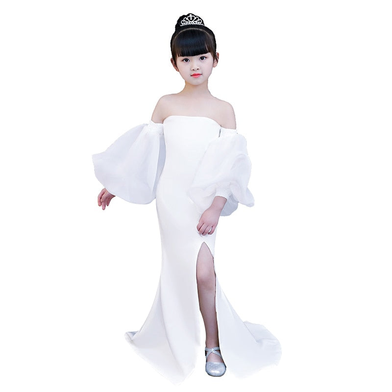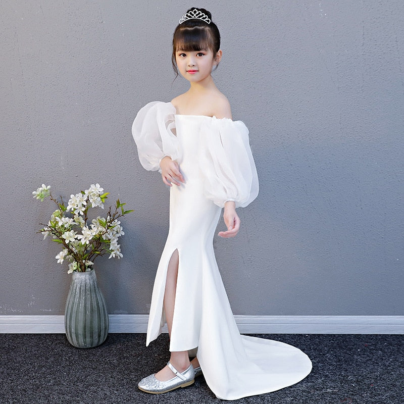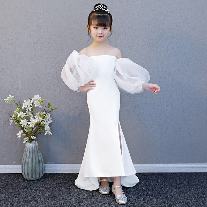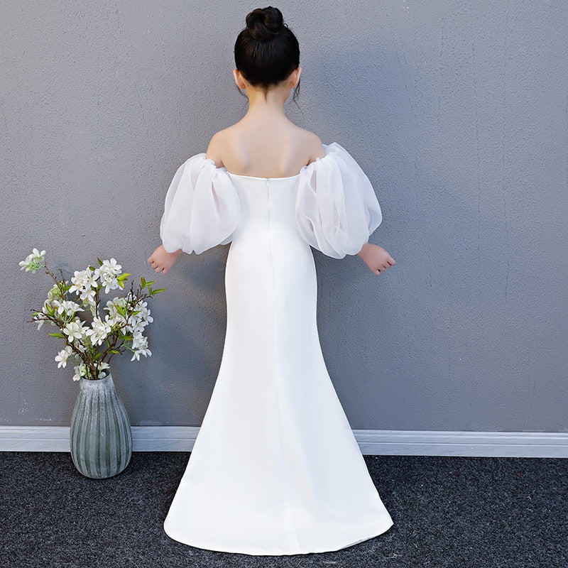 Introducing the White Mermaid Dress, a stunning choice for young girls aged 3 to 14 years. Perfect for any special occasion, this dress offers a classic, vintage-inspired look with a modern mermaid silhouette, making it ideal for graduation ceremonies, formal events, and other memorable celebrations.