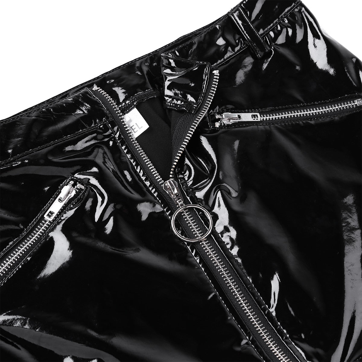 Women Shiny Wet Look Faux Leather Skirts Costumes Femme Skirts Stretchy Fake Zipper Pockets Bodycon Mini Skirt Sexy Party Clubwear