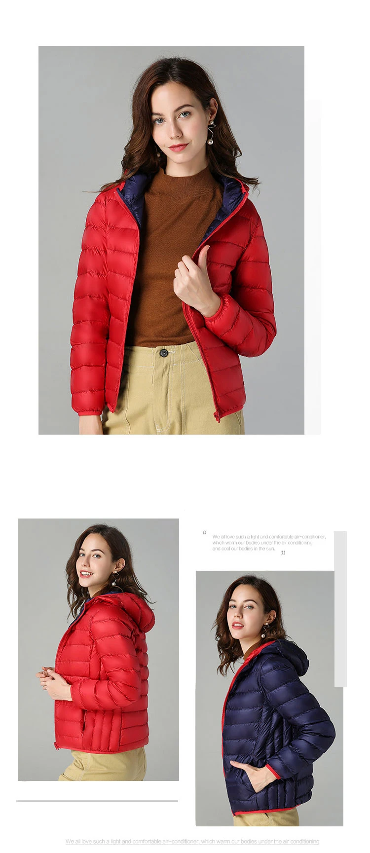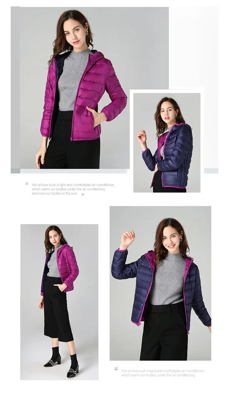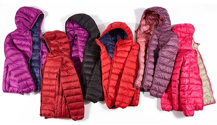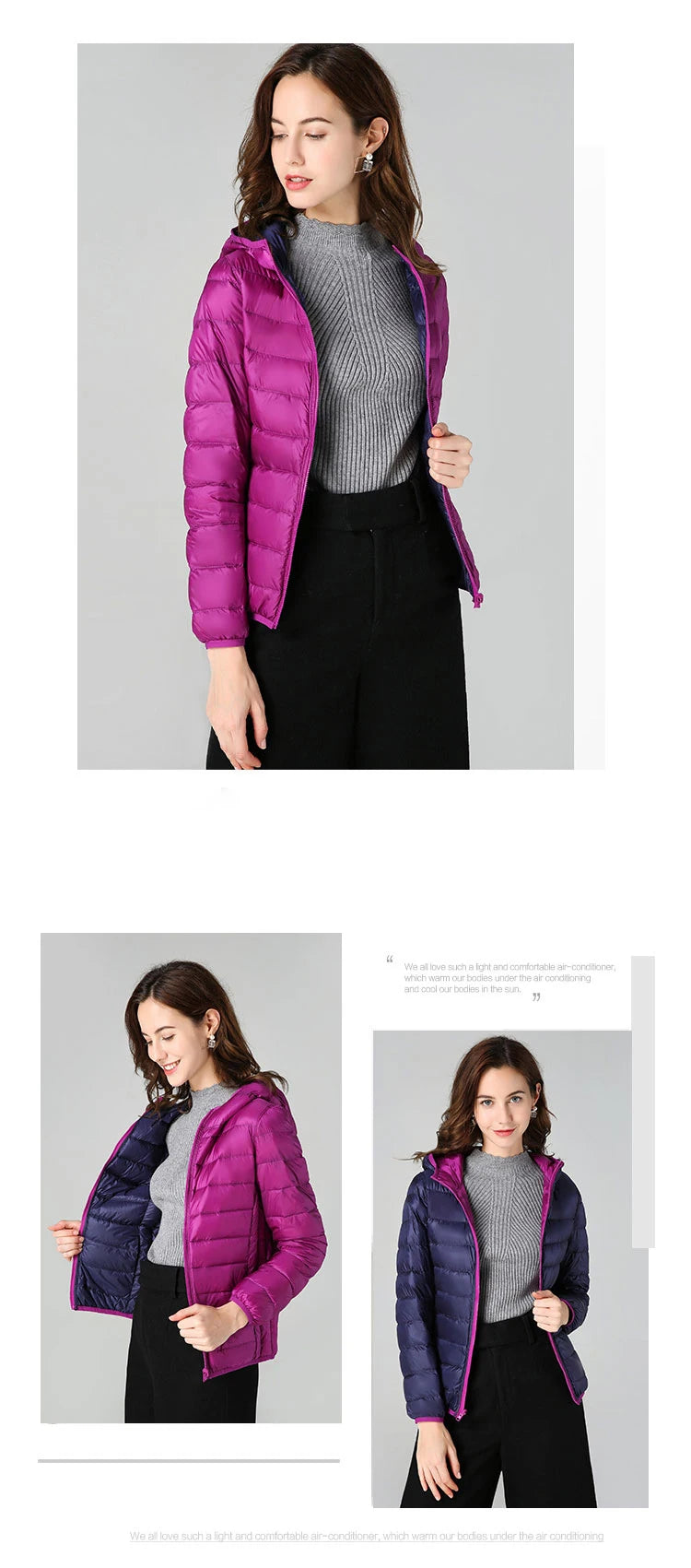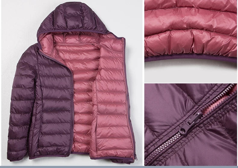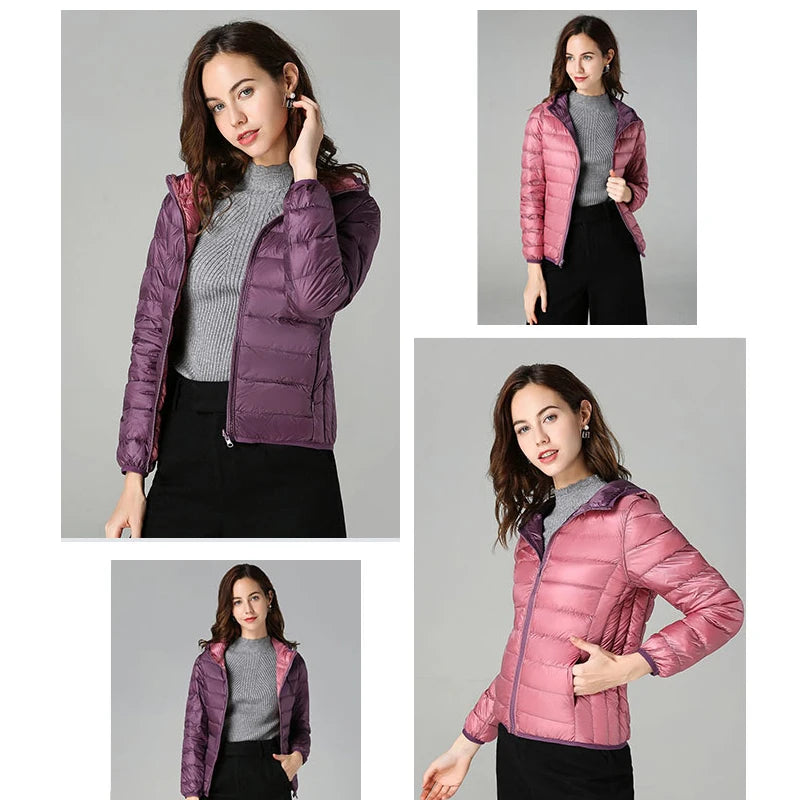 Introducing the Women Ultra Light 90% Duck Down Jacket – your ultimate companion for warmth and style this season. This hooded jacket features a sleek, modern design that combines functionality with a lightweight feel, making it an essential addition to your winter wardrobe. Perfect for any occasion, this puffer jacket for women offers superior insulation while remaining incredibly comfortable to wear.