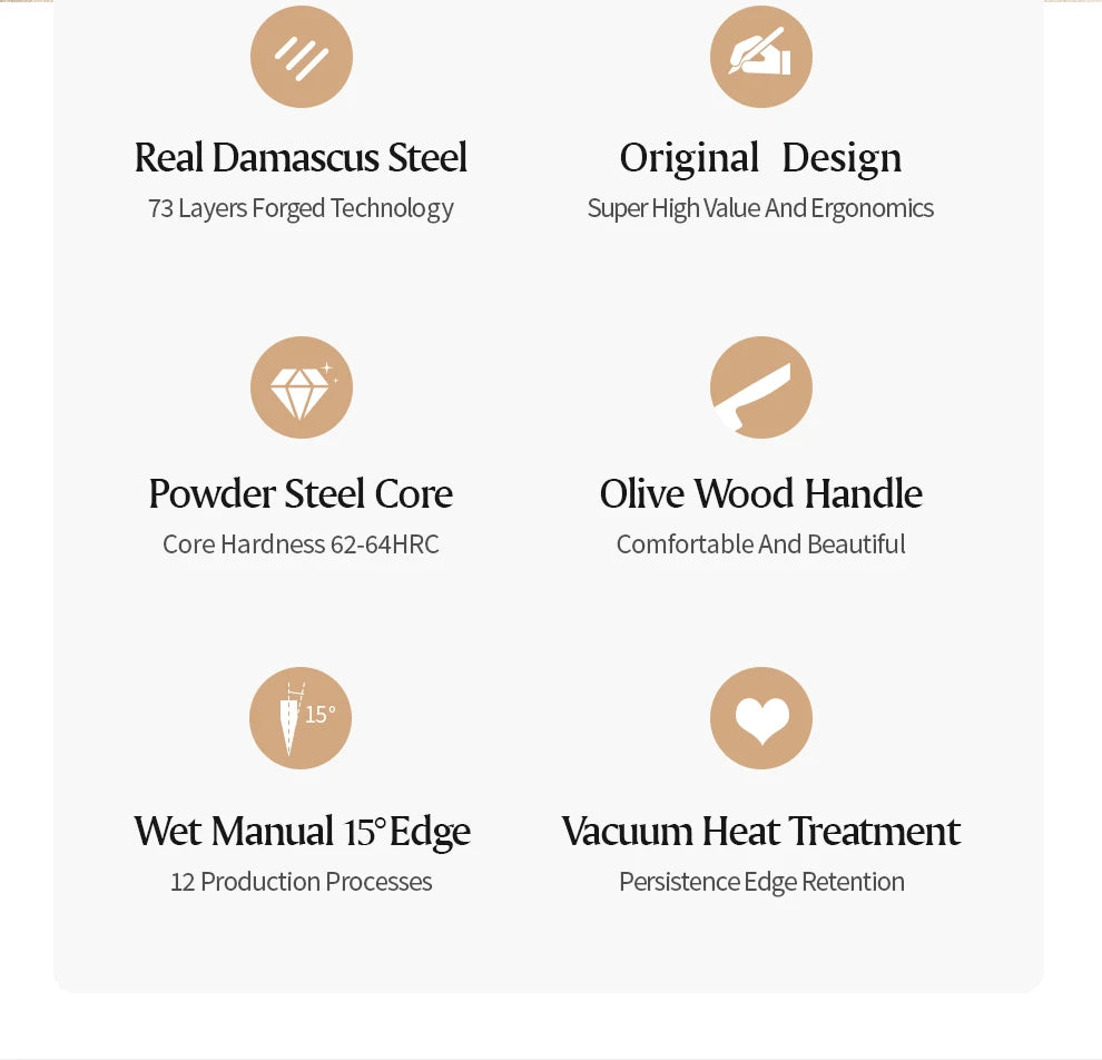 - Damascus Steel Blades: Made from 73 layers of custom Damascus steel, each knife is exceptionally sharp and durable, offering long-lasting performance.