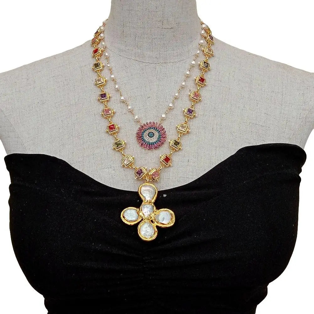 Discover Elegance: 2 Rows White Pearl Rosary Chain Cubic Zirconia Chain Necklace (44x52mm)