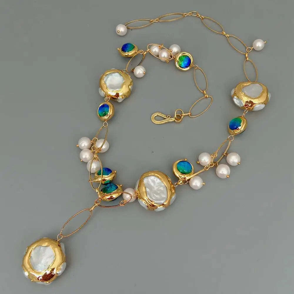 Discover Elegance with the Blue Murano Glass Freshwater Cultured White Keshi Pearl Gold Filled Chain